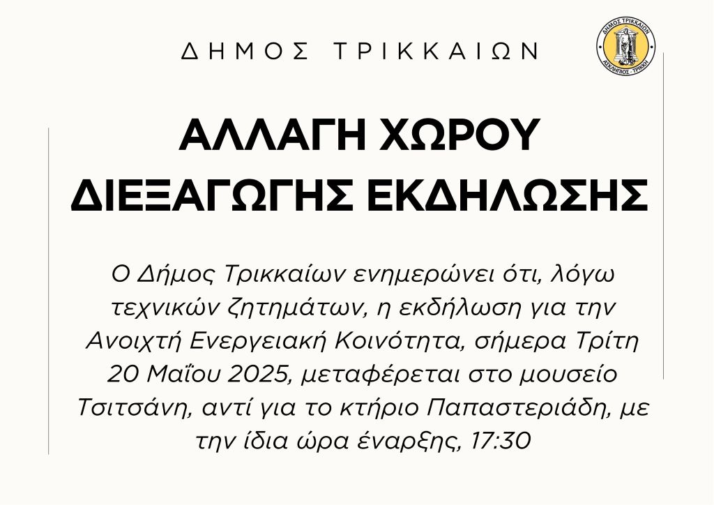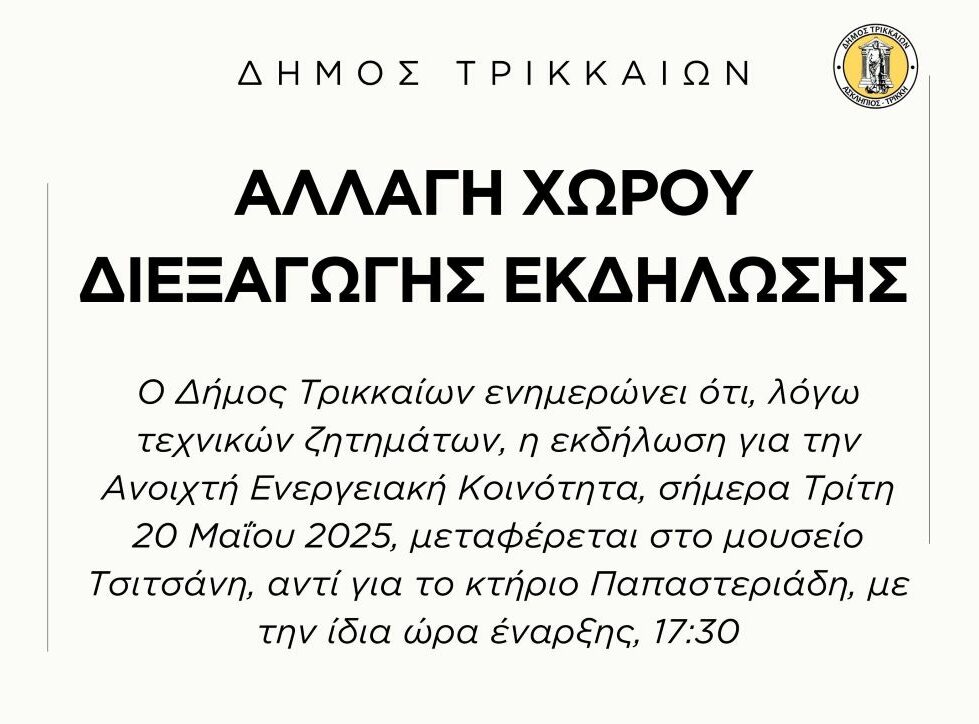 Ο Δήμος Τρικκαίων ενημερώνει ότι, λόγω τεχνικών ζητημάτων, η εκδήλωση για την Ανοιχτή Ενεργειακή Κοινότητα, σήμερα Τρίτη 20 Μαΐου 2025, μεταφέρεται στο μουσείο Τσιτσάνη, αντί για το κτήριο Παπαστεριάδη, με την ίδια ώρα έναρξης, 17:30