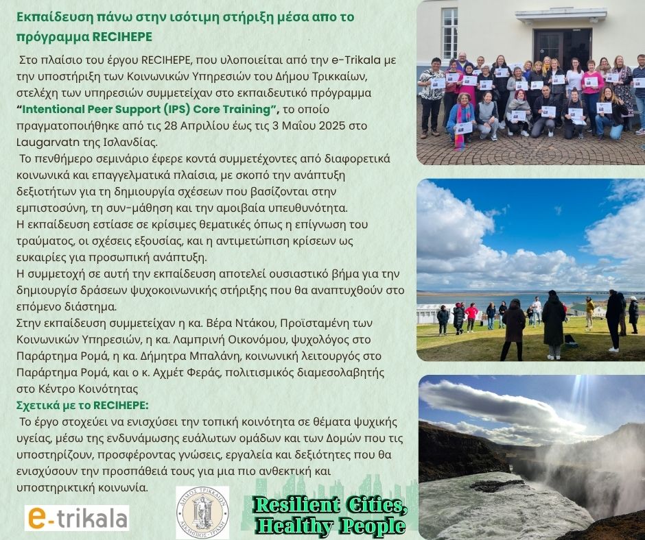 Στο πλαίσιο του έργου RECIHEPE, που υλοποιείται από την e-Trikala με την υποστήριξη των Κοινωνικών Υπηρεσιών του Δήμου Τρικκαίων, στελέχη των υπηρεσιών συμμετείχαν στο εκπαιδευτικό πρόγραμμα “Intentional Peer Support (IPS) Core Training”, το οποίο πραγματοποιήθηκε από τις 28 Απριλίου έως τις 3 Μαΐου 2025 στο Laugarvatn της Ισλανδίας.