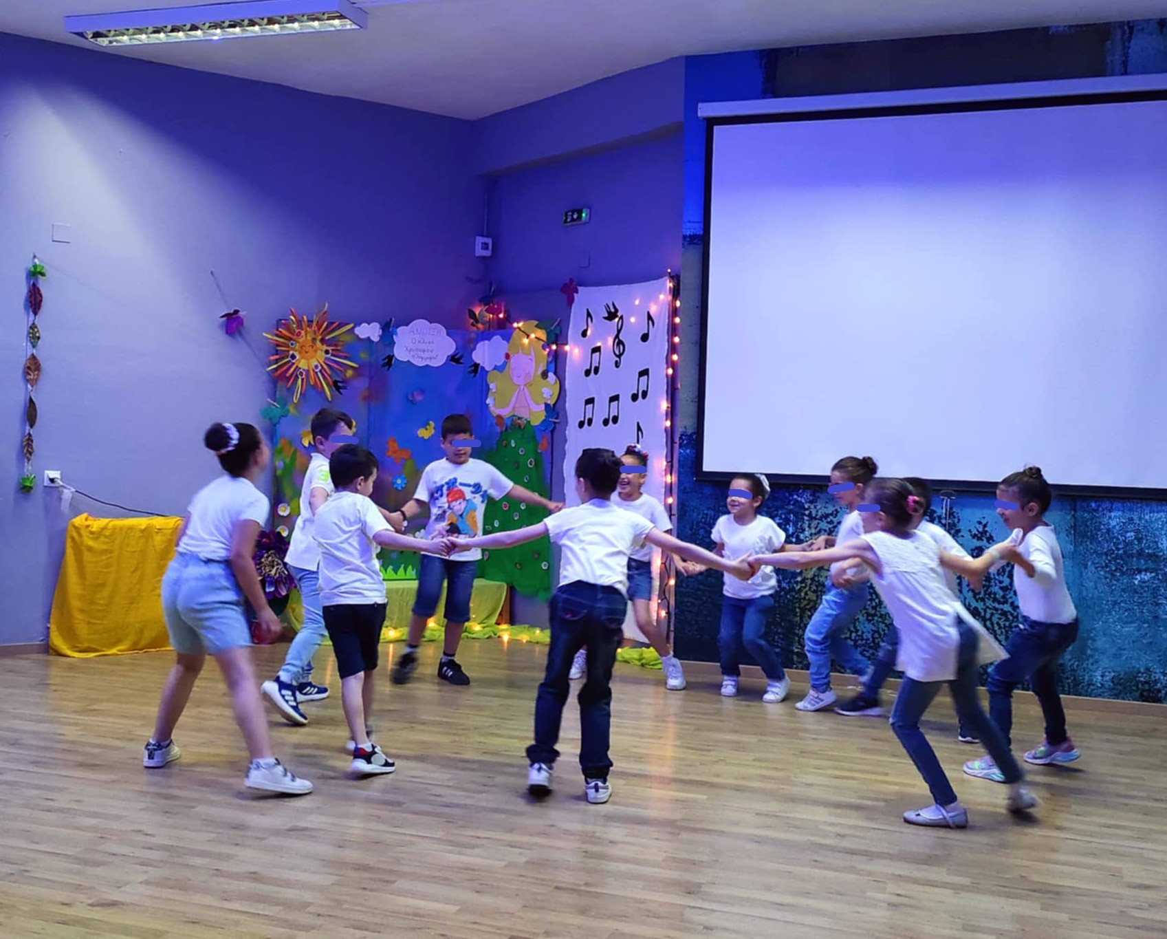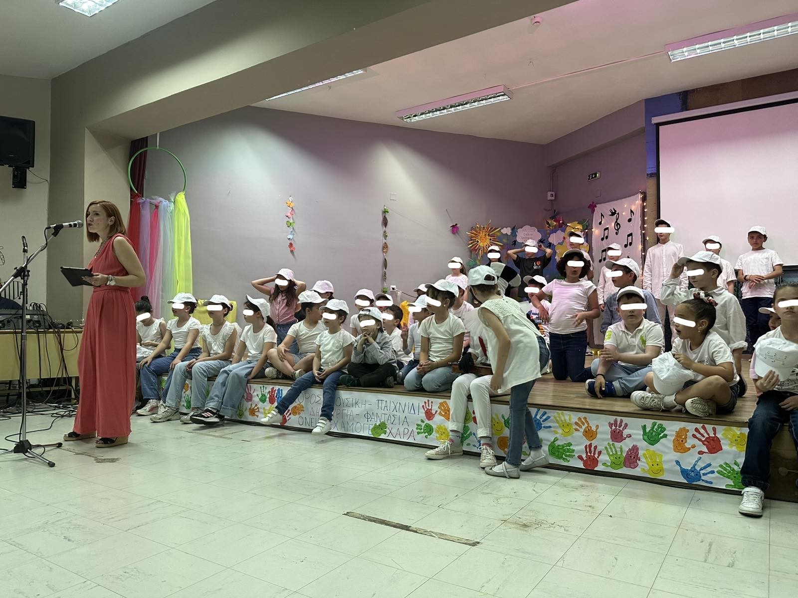 Το κλείσιμο του πρώτου μέρους της γιορτής ολοκληρώθηκε με την ξεχωριστή χορογραφία και των χαιρετισμό όλων των παιδιών με την καθοδήγηση της κ. Ντίνας Οικονομίδου, φορώντας τα καπέλα – δώρα.