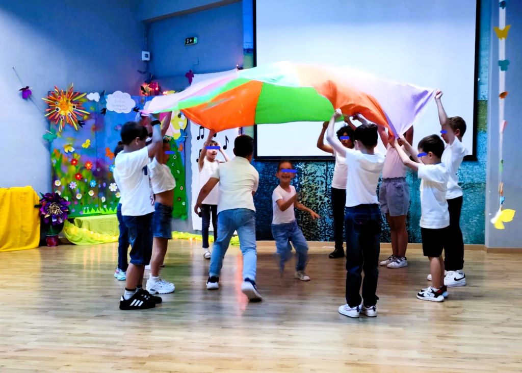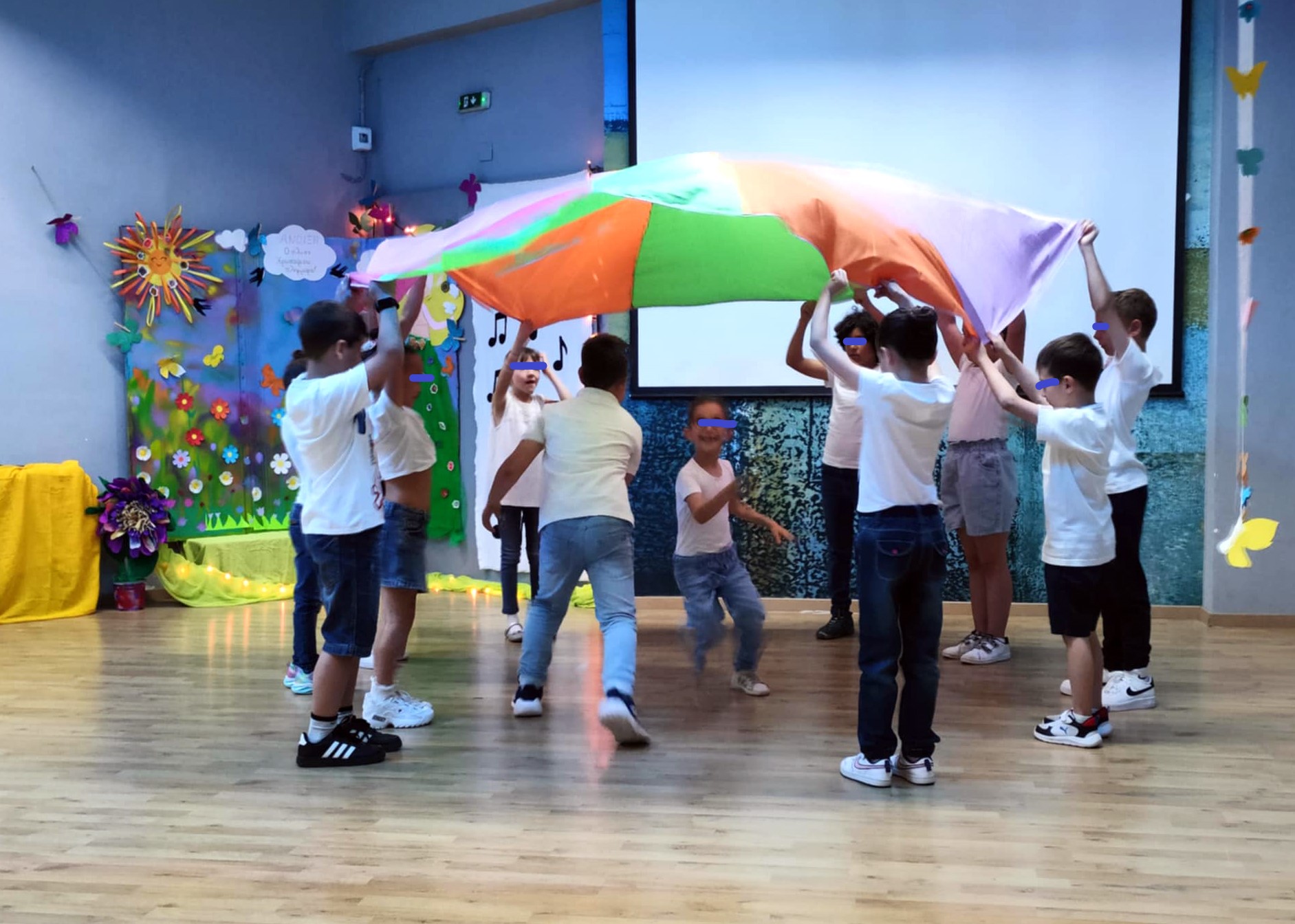 Ιδιαίτερα ξεχωριστή ήταν και η παρουσίαση παιχνιδιών δεξιοτήτων με μαντήλια, τα οποία δημιούργησαν τα παιδιά με την καθοδήγηση των εκπαιδευτικών φυσικής αγωγής κ. Μαρίας Ψύχου και κ. Μαρίας Μανιώτη. Τα παιχνίδια ανέδειξαν τη σημασία της συνεργασίας και της κριτικής σκέψης μέσα από τη χαρά της συμμετοχής.