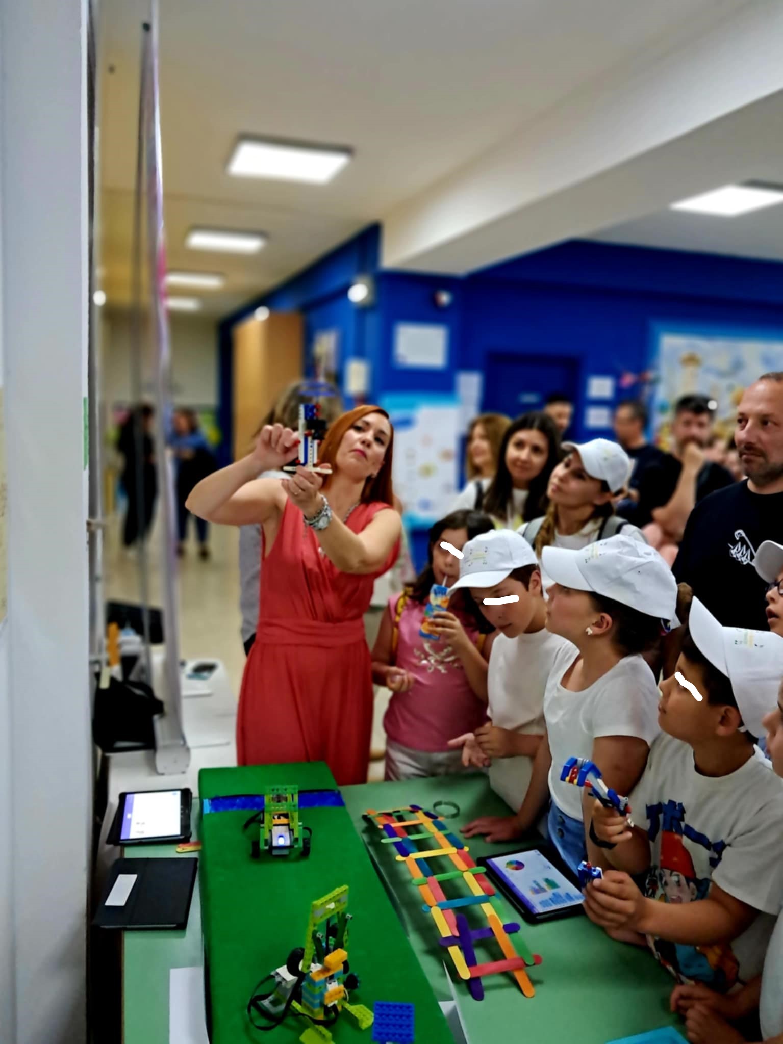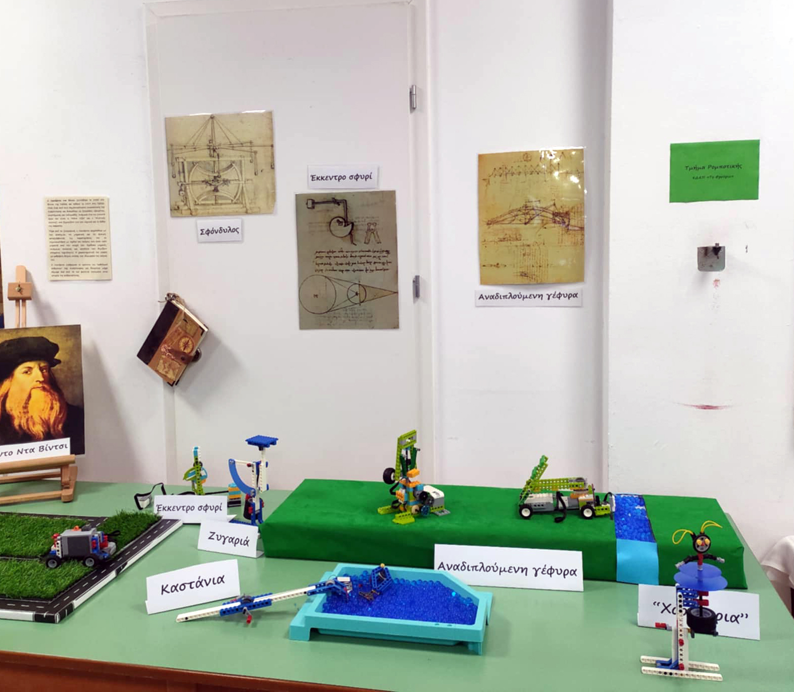 Στο δεύτερο μέρος της Γιορτής, η καθηγήτρια Πληροφορικής και Ρομποτικής κ. Χριστίνα Μητσιάδη καθοδήγησε τους μαθητές σε μια διαδραστική έκθεση ρομποτικής βασισμένη στα έργα του Λεονάρντο Ντα Βίντσι. Τα παιδιά κλήθηκαν να γνωρίσουν τον μαγικό κόσμο της ρομποτικής προχωρώντας στην κατασκευή ρομποτικών μηχανών εμπνευσμένων από σχέδια και αναπαραστάσεις ιστορικών μηχανών του μεγάλου οραματιστή, αλλά και άλλων εφευρέσεων μέσα στα πλαίσια της δημιουργικότητας και της καινοτομίας. Μέσα από αυτή τη δημιουργική προσέγγιση τα παιδιά πειραματίστηκαν και ανακάλυψαν πως η φαντασία μπορεί να γίνει τεχνολογία.