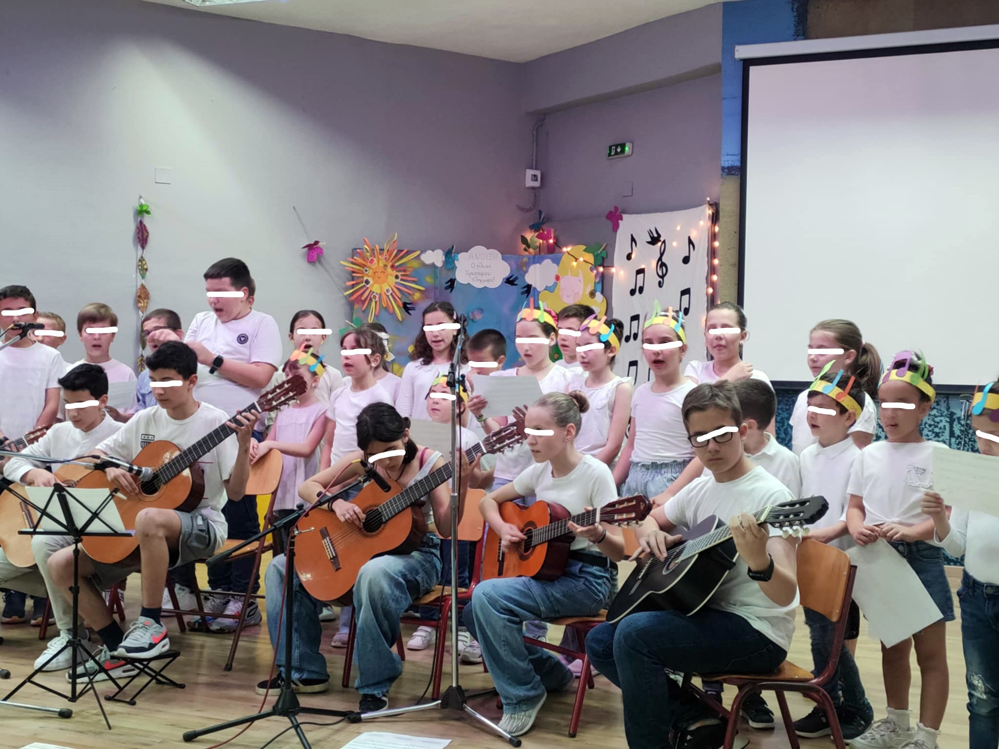 Ακολούθησε η μουσική ενότητα της εκδήλωσης, με τη συμμετοχή μαθητών του μαθήματος κιθάρας και του τμήματος μουσικών παιχνιδιών, υπό την καθοδήγηση του μουσικού κ. Νίκου Πουλιανίτη. Οι μαθητές παρουσίασαν έργα που μελέτησαν όλη τη χρονιά, ενώ οι τελειόφοιτοι της ΣΤ΄ τάξης αποχαιρέτησαν τη δομή με συγκίνηση, κλείνοντας έναν σημαντικό κύκλο μάθησης και δημιουργίας. Η μουσική ενότητα ανέδειξε τη βαθιά και ουσιαστική σχέση που έχει καλλιεργηθεί ανάμεσα στους μαθητές και τους δασκάλους τους.