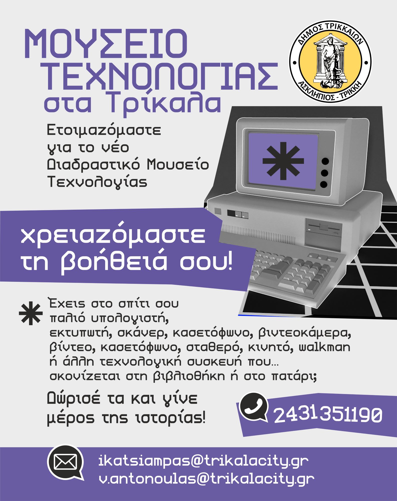 Όσοι/ες επιθυμούν να προσφέρουν αντικείμενα ή να συμβάλουν με οποιονδήποτε τρόπο στη συλλογή, μπορούν να επικοινωνούν με τον Δήμο Τρικκαίων στον τηλεφωνικό αριθμό 2431351190 ή στα emails [email protected] και [email protected].