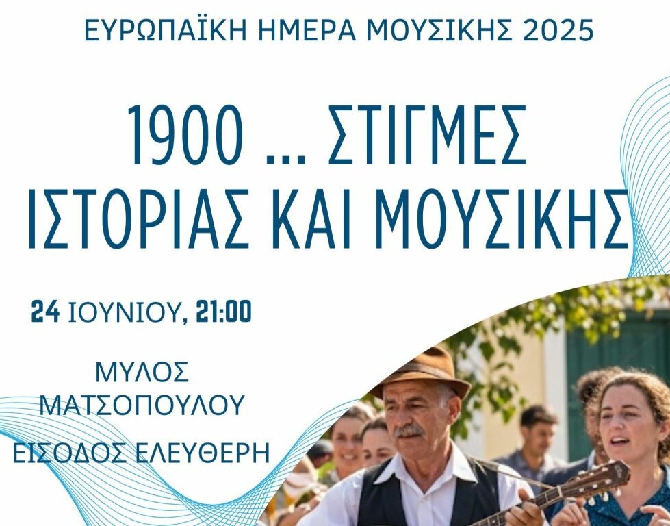 Στις 9 το βράδυ, στον Μύλο Ματσόπουλου, η μουσική παράσταση «1900 … Στιγμές Ιστορίας και Μουσικής» ανατρέχει στις σημαντικότερες ιστορικά στιγμές και τα τραγούδια – σταθμός που σημαδέψαν τον περασμένο αιώνα. Με ερμηνευτές την Χρυσή Παπαγιαννούλη, την Κωνσταντίνα Πάλλα, τον Μπάμπη Αντωνίου και τον Κώστα Οκκα και ε την «Ορχήστρα των Τρικάλων», η βραδιά αναμένεται να καλύψει το μεγαλύτερο τμήμα των μουσικών στιγμών ενός ολόκληρου αιώνα. Στην παράσταση θα παρίστανται, η Πρέσβειρα της Γαλλικής Δημοκρατίας στην Ελλάδα ΑΕ κ. Laurence Auer, ο πρόξενος της Γαλλίας στη Θεσσαλονίκη κ. Jean-Luc Lavaud, η διευθύντρια του Γαλλικού Ινστιτούτου Λάρισας κ. Χρύσα Βουλγαράκη, η πρόεδρος της Ελληνικής Κοινότητας στο Παρίσι, κ. Σέτα Θεοδωρίδη.