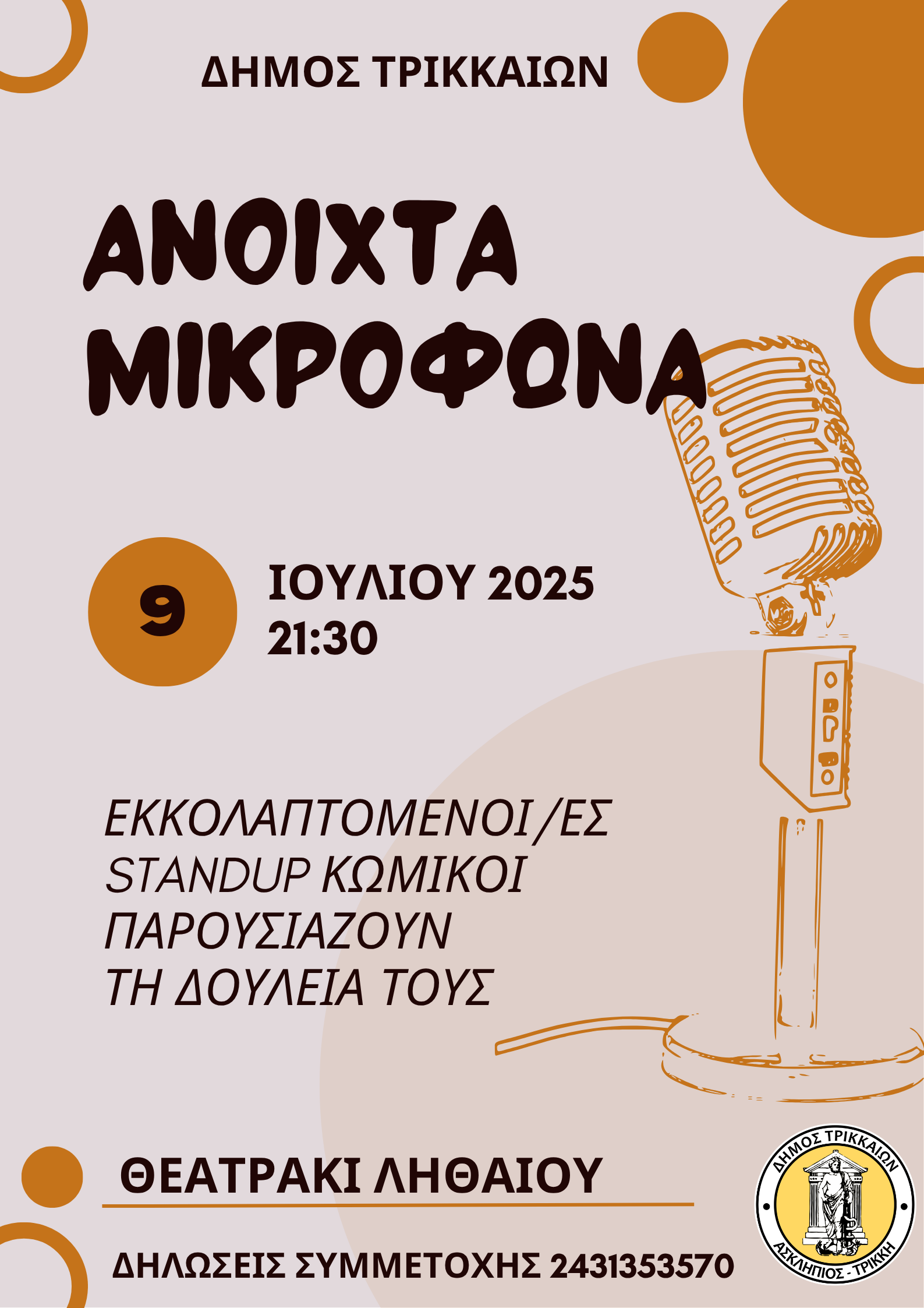 Ατάκες, γέλια και κριτική… όσα αγαπούμε στο standup comedy ανιχνεύει ο Δήμος Τρικκαίων! Και προσκαλεί όσους και όσες επιθυμούν να παρουσιάσουν τη δουλειά τους, τις εμπνεύσεις τους, την πρωτοτυπία τους ως stand up κωμικοί, να το κάνουν ενώπιον τρικαλινών! Την Τετάρτη 9 Ιουλίου 2025, στις 21:30, στο όμορφο θεατράκι του Ληθαίου, οι εκκολαπτόμενοι/ες, ερασιτέχνες/ιδες standup comedians, μπορούν να απευθυνθούν στο τρικαλινοί κοινό, στην εκδήλωση που διοργανώνει η Δ/νσης Παιδείας, Πολιτισμού, Αθλητισμού.
