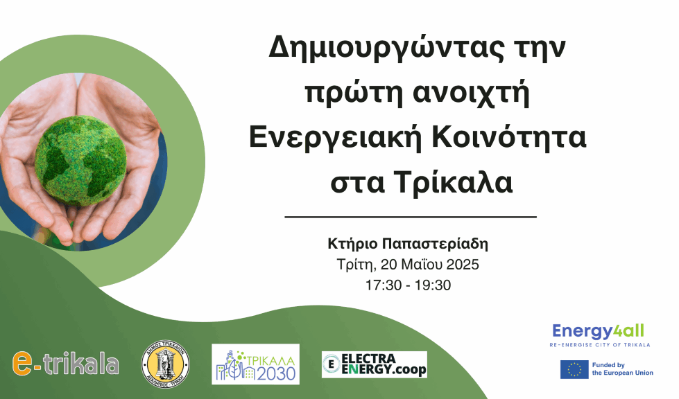 Τα Τρίκαλα κάνουν το πρώτο βήμα στην κοινοτική ενέργεια. Στο πλαίσιο του ευρωπαϊκού έργου ENERGY4ALL, η e-trikala ΑΕ και ο Δήμος Τρικκαίων, με την υποστήριξη της Electra Energy, διοργανώνουν ανοιχτή ενημερωτική εκδήλωση με τίτλο «Δημιουργώντας την Πρώτη Ανοιχτή Ενεργειακή Κοινότητα στα Τρίκαλα». Η ανοιχτή εκδήλωση θα πραγματοποιηθεί την Τρίτη 20 Μαΐου 2025, τις ώρες 17:30–19:30 στο κτήριο Παπαστεριάδη (Στουρνάρα 14).