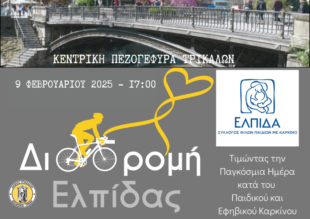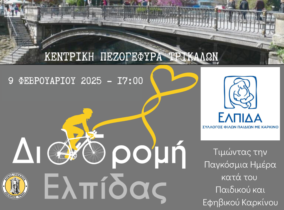 Την Κυριακή 9 Φεβρουαρίου 2025 στις 17:00 ο ποδηλάτης θα βρίσκεται στην κεντρική πεζογέφυρα των Τρικάλων, για να δοθεί το μήνυμα και να συμβάλει στη διάδοση του έργου του Σωματείου «ΕΛΠΙΔΑ – Σύλλογος Φίλων Παιδιών με καρκίνο». Σε μια πόλη με δεκάδες χιλιάδες ποδήλαα, το μήνυμα «κάθε χιλιόμετρο, μια δέσμευση. Κάθε πόλη, μια αγκαλιά. Κάθε στάση, ένα μήνυμα ελπίδας», αποκτά ιδιαίτερη αξία.