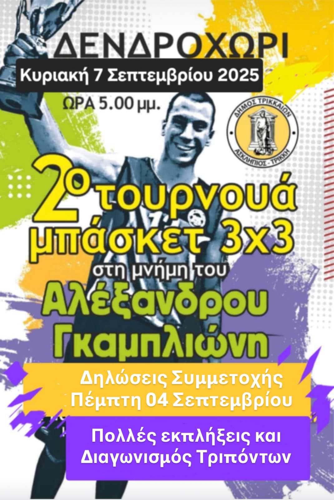 Το 2ο τουρνουά μπάσκετ 3Χ3 στη μνήμη Αλέξανδρου Γκαμπλιώνη διοργανώνει ο Δήμος Τρικκαίων την Κυριακή 7 Σεπτεμβρίου 2025 στο Δενδροχώρι. Το 1ο τουρνουά πραγματοποιήθηκε με την ευκαιρία των εγκαινίων του γηπέδου στο χωριό και πλέον, με την ευκαιρία και του τοπικού πανηγυριού, οι αγώνες θα πραγματοποιηθούν στο γήπεδο. Η έναρξη των αγώνων θα γίνει στις 5 το απόγευμα, θα υπάρχει διαγωνισμός τριπόντων και εκπλήξεις.