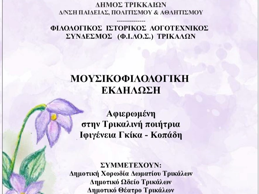 Ο Δήμος Τρικκαίων και ο Φ.Ι.ΛΟ.Σ. Τρικάλων διοργανώνουν μουσικοφιλολογική εκδήλωση αφιερωμένη στην Τρικαλινή ποιήτρια Ιφιγένεια Γκίκα – Κοπάδη. Η εκδήλωση θα πραγματοποιηθεί την Τρίτη 13 Μαΐου 2025, στις 19.30 στο Πνευματικό Κέντρο Δήμου Τρικκαίων «Αθανάσιος Τριγώνης».