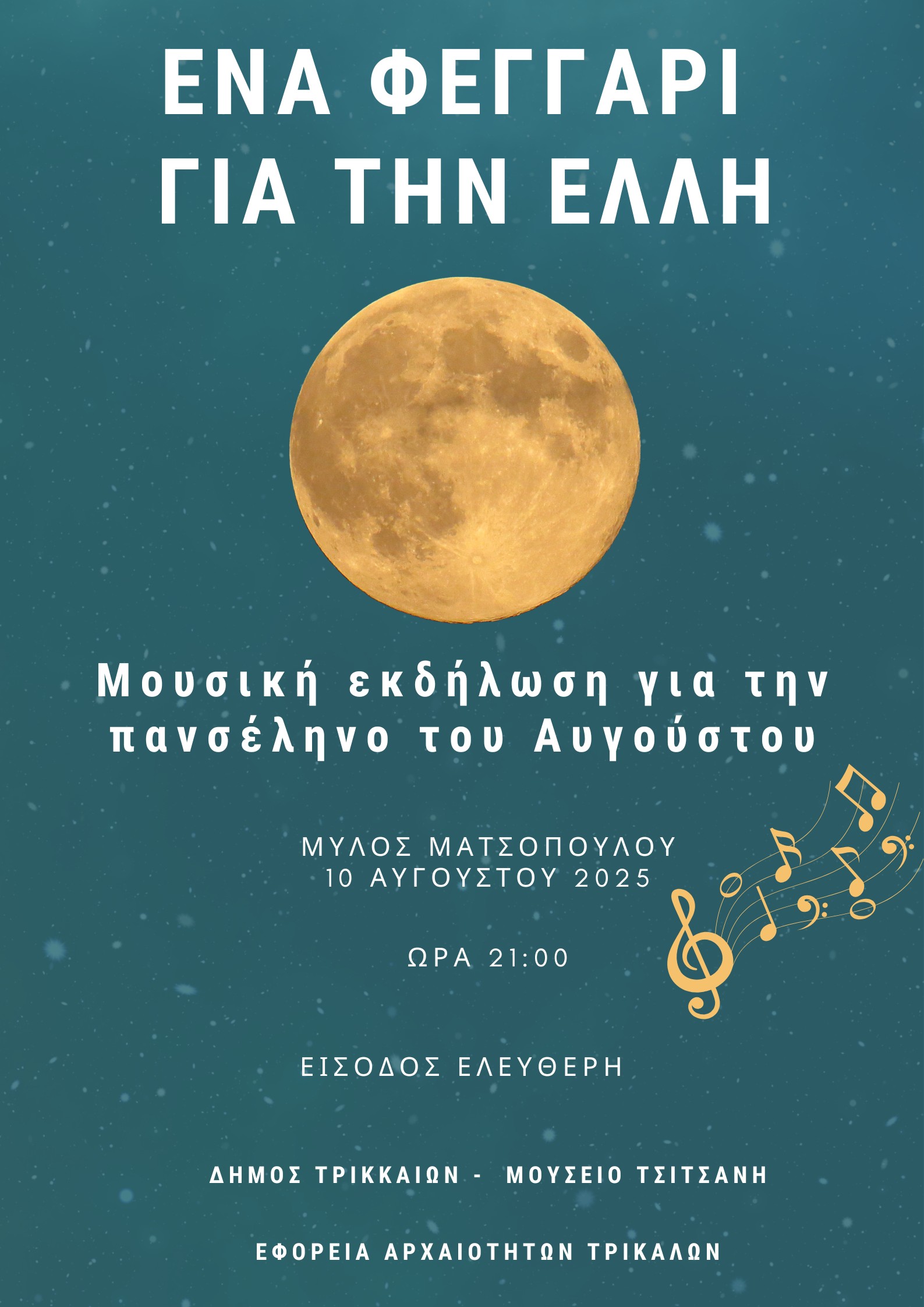Την πανσέληνο του Αυγούστου υποδέχονται τα Τρίκαλα, σε μια εκδήλωση στον Μύλο Ματσόπουλου. Η μουσική εκδήλωση είναι αφιερωμένη στην Έλλη Διβάνη και θα πραγματοποιηθεί την Κυριακή 10 Αυγούστου, στις 21:00, στον Μύλο Ματσόπουλου, με ελεύθερη είσοδο.