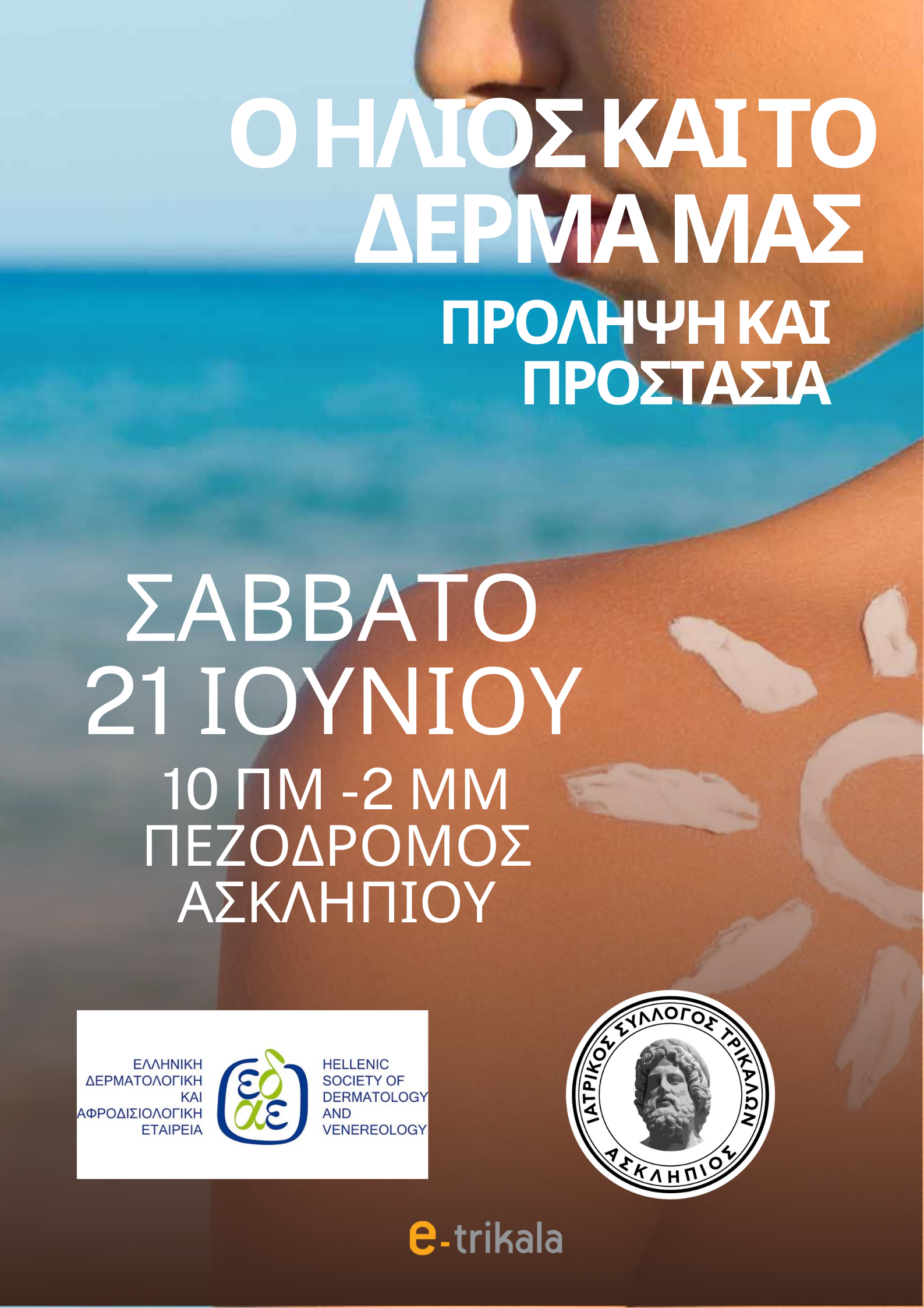 Ο Ιατρικός Σύλλογος Τρικάλων και η Ελληνική Δερματολογική Εταιρεία, με τη συνεργασία της e-trikala ΑΕ, διοργανώνει δράση ενημέρωσης και ευαισθητοποίησης του κοινού με θέμα: «Ο ήλιος και το δέρμα μας: πρόληψη και προστασία», στο πλαίσιο της ευρύτερης προσπάθειας για την πρόληψη των δερματικών παθήσεων που σχετίζονται με την ηλιακή ακτινοβολία.