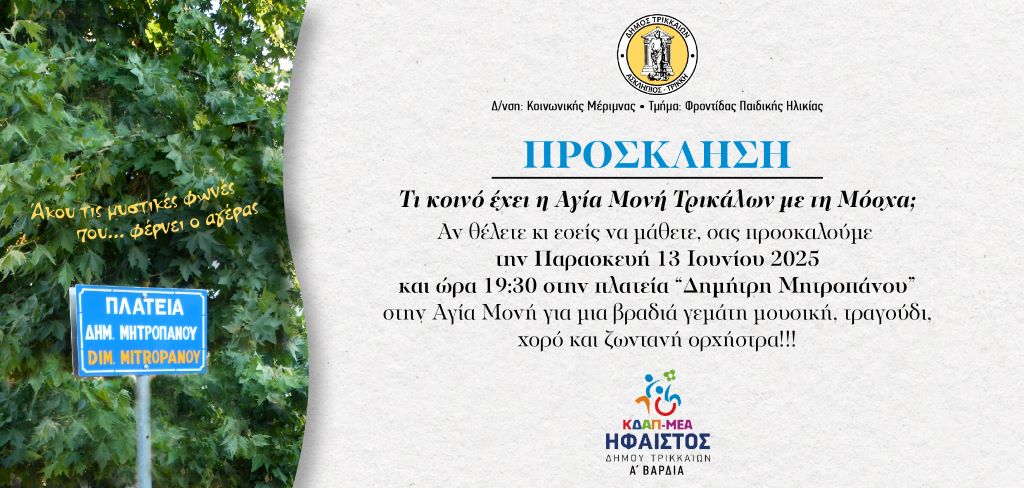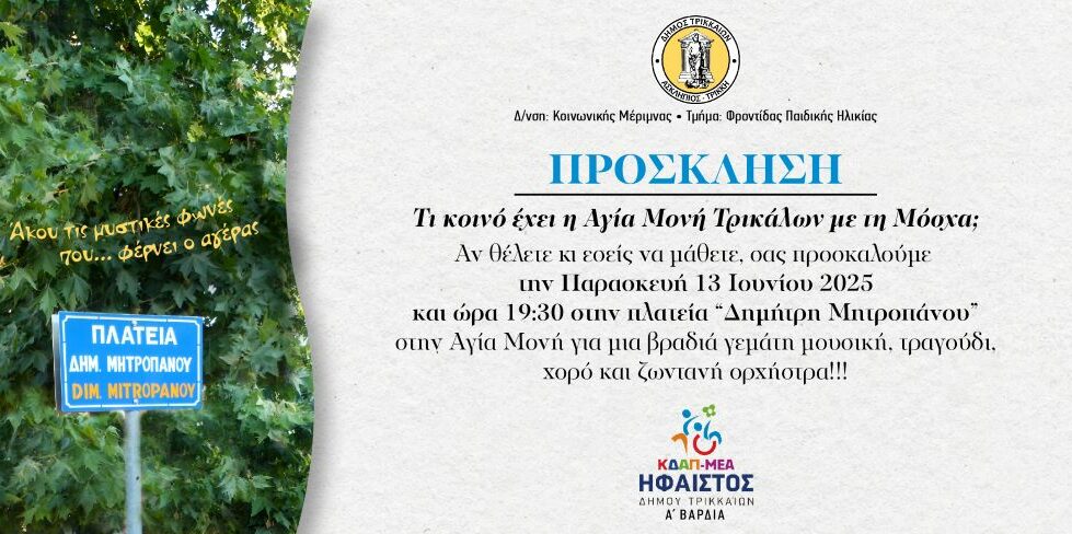 Εκδήλωση για την ολοκλήρωση της φετινής χρονιάς διοργανώνει το ΚΔΑΠ ΜΕΑ «ΗΦΑΙΣΤΟΣ» του Δήμου Τρικκαίων, Αυτή τη φορά, επιλέγει την πλατεία «Δημήτρη Μητροπάνου», στην Αγία Μονή, απευθύνοντας το ερώτημα: «Τι κοινό έχει η Αγία Μονή Τρικάλων με τη Μόσχα»;
