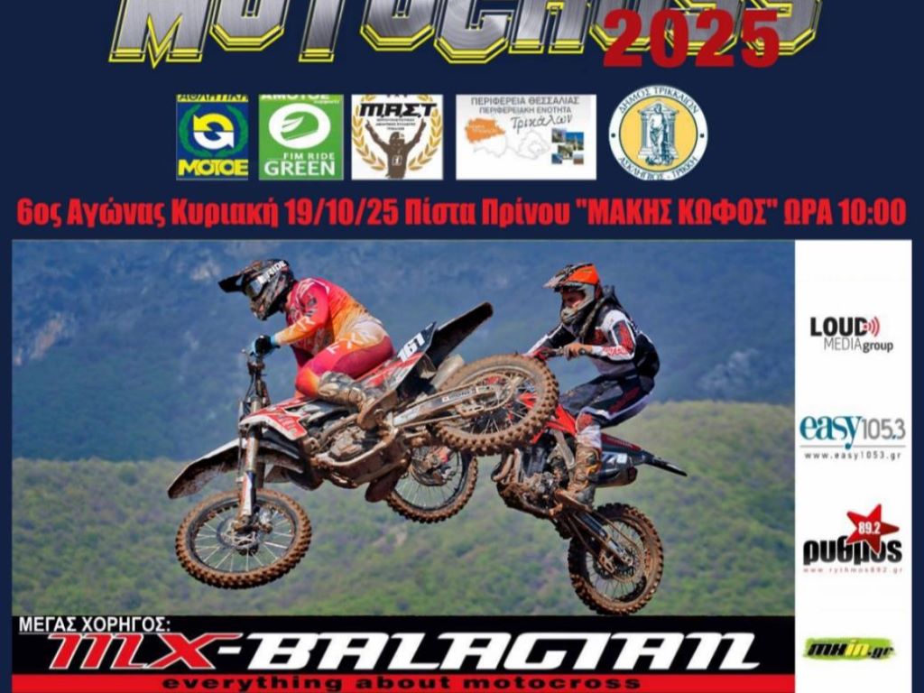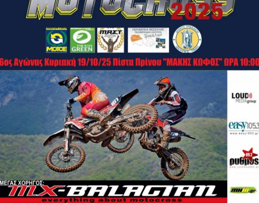 Με τον έκτο αγώνα για το Πανελλήνιο Πρωτάθλημα Motocross συνεχίζονται στον Δήμο Τρικκαίων οι αγώνες μότο κρος. Την Κυριακή 19 Οκτωβρίου διεξάγεται στην πίστα «Μάκης Κωφός», στον Πρίνο, 6ος αγώνας για το Πανελλήνιο Πρωτάθλημα Motocross. Προηγήθηκαν, στις 5 Οκτωβρίου, δύο αγώνε για το κύπελλο Ελλάδας.