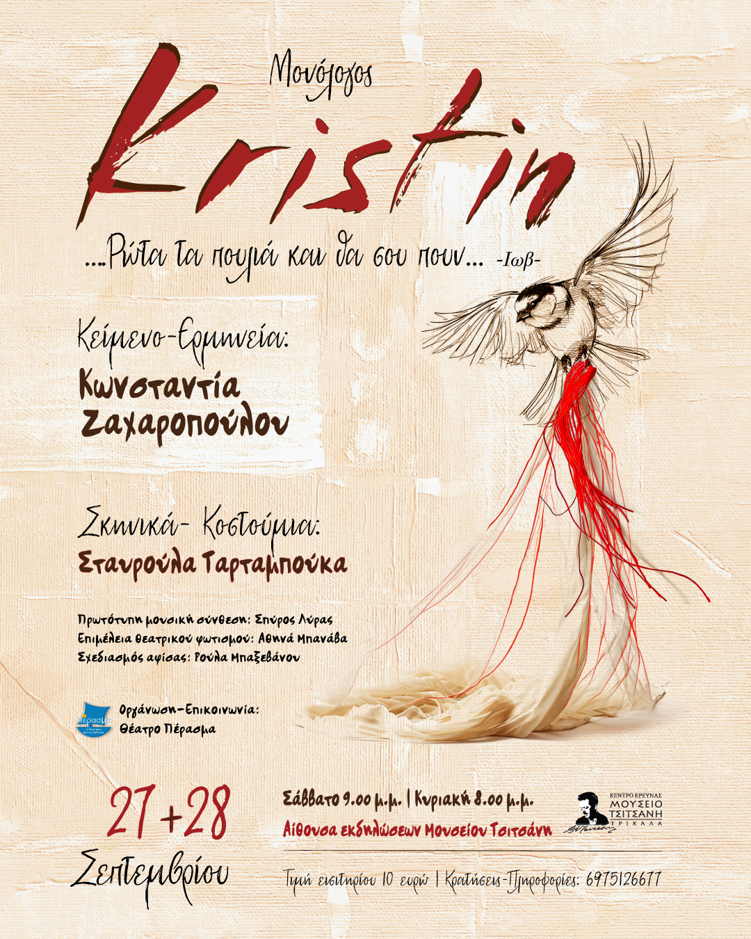 Το Θέατρο «Πέρασμα» παρουσιάζει τον θεατρικό μονόλογο «Κριστίν» στο Μουσείο Τσιτσάνη, το διήμερο 27 και 28 Σεπτεμβρίου 2025.