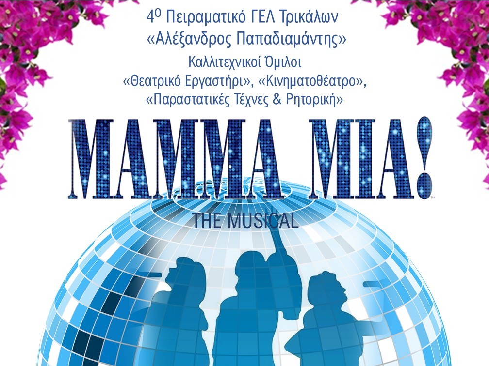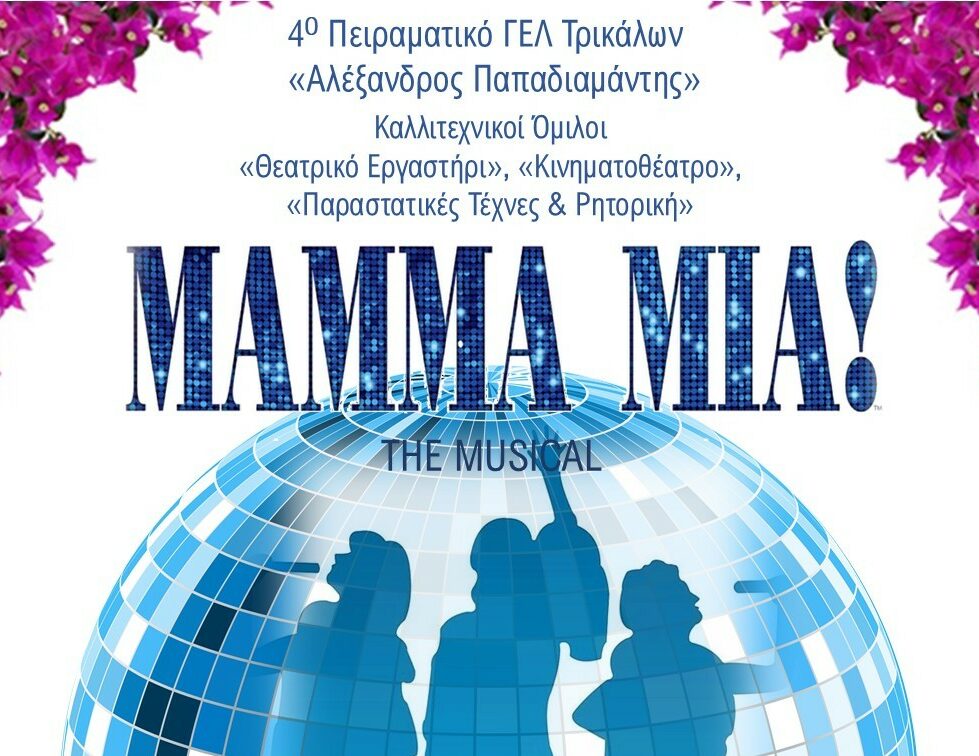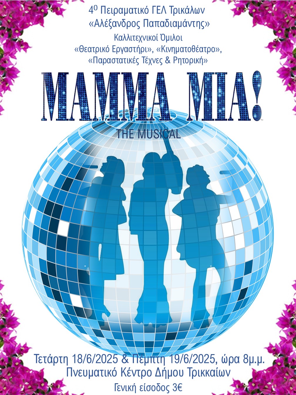 Οι Καλλιτεχνικοί Όμιλοι «Θεατρικό Εργαστήρι», «Κινηματοθέατρο» και «Παραστατικές Τέχνες και Ρητορική» του 4ου Πειραματικού Γενικού Λυκείου Τρικάλων «Αλέξανδρος Παπαδιαμάντης» παρουσιάζει την Τετάρτη 18/6/2025 και Πέμπτη 19/6/2025, ώρα 20.00μ.μ., στην αίθουσα του Πνευματικού Κέντρου Δήμου Τρικκαίων τη μουσικοχορευτική παράσταση “Mamma Mia: The Musical”.