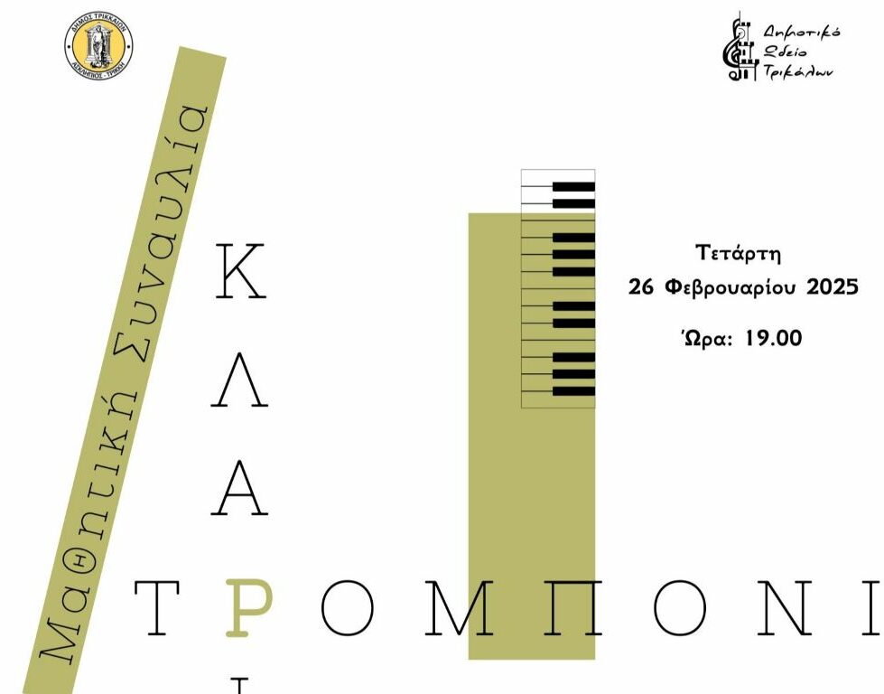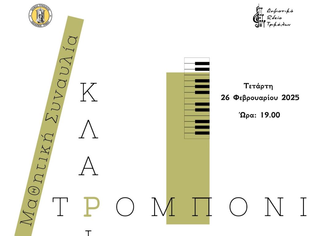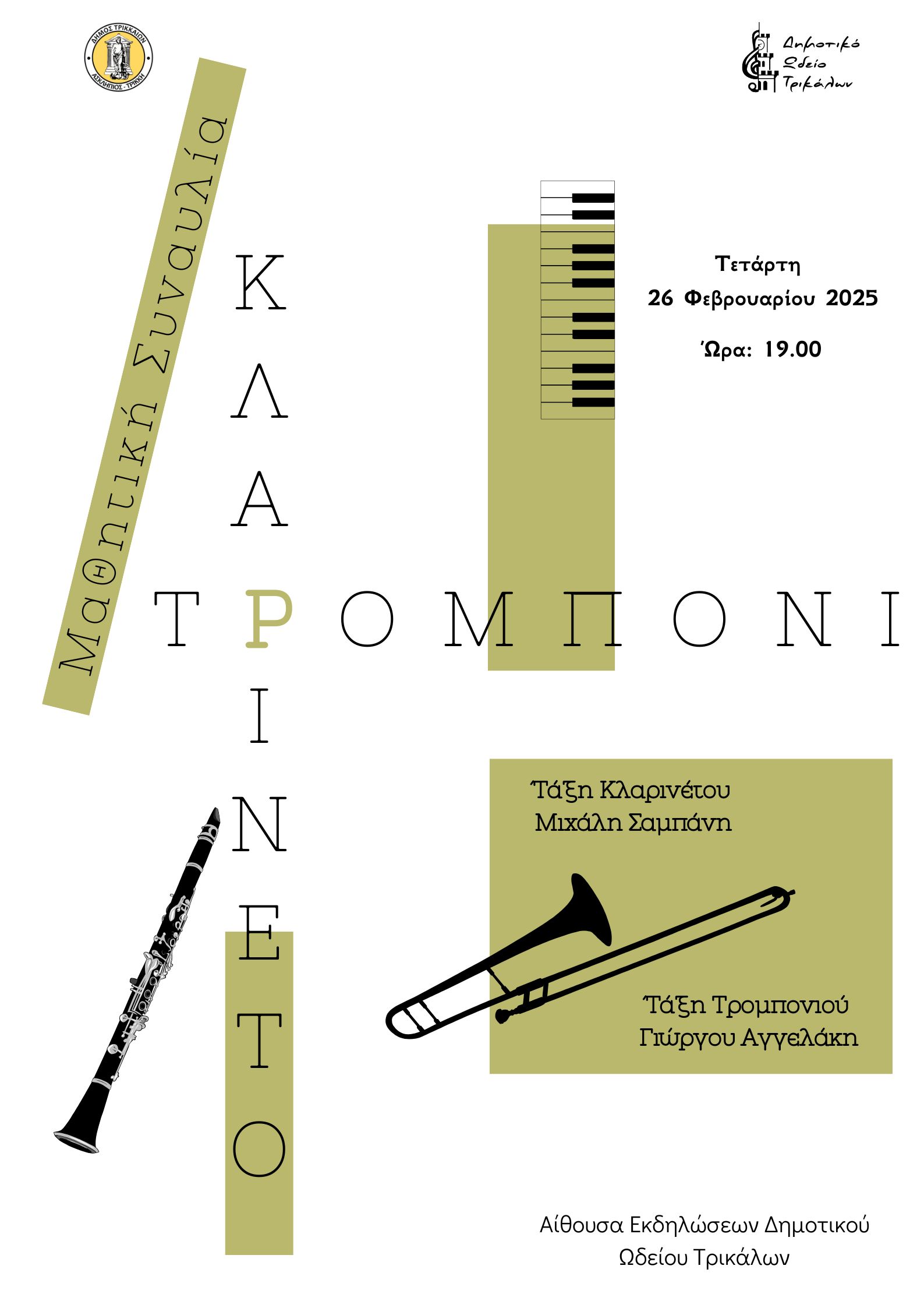 Μια μουσική βραδιά με τους μαθητές των τάξεων τρομπονιού και κλαρινέτου του Δημοτικού Ωδείου Τρικάλων θα πραγματοποιηθεί την Τετάρτη 26 Φεβρουαρίου 2025 στις 19:00 στην αίθουσα εκδηλώσεων του Δημοτικού Ωδείου Τρικάλων. Οι μαθητές, υπό την καθοδήγηση των καθηγητών Γιώργου Αγγελάκη (τρομπόνι) και Μιχάλη Σαμπάνη (κλαρινέτο), θα παρουσιάσουν το μουσικό τους ταλέντο.