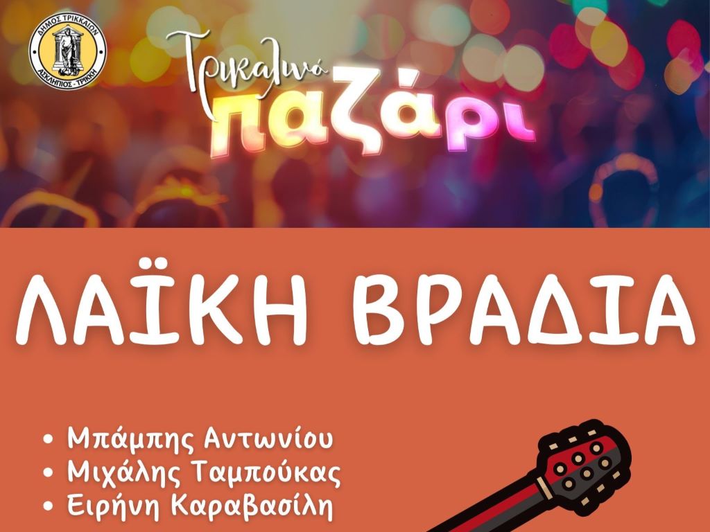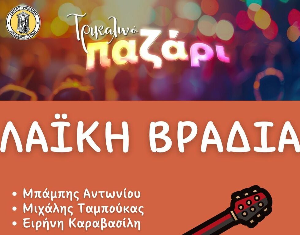 Τα Τρίκαλα αποχαιρετούν για φέτος το Παζάρι, με λαϊκή βραδιά. Οι εκδηλώσεις του Δήμου Τρικκαίων ολοκληρώνονται την τελευταία ημέρα διεξαγωγής του Παζαριού και έτσι το Σάββατο 20 Σεπτεμβρίου, θα παρουσιαστεί ένα πρόγραμμα με τους Μπάμπη Αντωνίου,  Μιχάλη Ταμπούκα και Ειρήνη Καραβασίλη, με τις πενιές του Αχιλλέα Τσιακμάκη. Παρέα με τα ομορφότερα λαϊκά τραγούδια από τους μεγάλους τρικαλινούς δημιουργούς, ο Δήμους Τρικκαίων προσκαλεί όλους και όλες σε μια όμορφη μουσική συνάντηση!