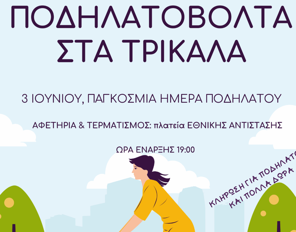 Την Παγκόσμια Ημέρα Ποδηλάτου γιορτάζει με μεγάλη ποδηλατοβόλτα ο Δήμος Τρικκαίων. Στην πόλη με τα πάνω από 40.000 ποδήλατα και τους συνεχώς αυξανόμενους ποδηλατοδρόμους, οι ποδηλάτες και οι ποδηλάτισσες συγκεντρώνονται την Τρίτη 3 Ιουνίου 2025, ανήμερα της Παγκόσμιας Ημέρας, στις 19:00, στην πλατεία Εθνικής Αντίστασης. Από εκεί θα ξεκινήσει μια όμορφη βόλτα, με ασφάλεια και προστασία για όλες τις ηλικίες. Η διαδρομή είναι 10 χιλιόμετρα και θα ακολουθήσει την πορεία: Πλατεία Εθνικής Αντίστασης – οδός Ιακωβάκη – (δεξιά) γέφυρα Γκίκα – αριστερά αμέσως μετά τη γέφυρα – πίσω από το μουσείο Τσιτσάνη – (ευθεία) οδός Δαβάκη – αριστερά στην οδό Τερτίπη – δεξιά στην οδό Καλυψούς – αριστερά γέφυρα Αρριανού – δεξιά οδός Λέσβου – ευθεία στη γέφυρα Καρδίτσης απέναντι στην οδό Σκοπέλου – ευθεία προς Καρυές – Φλαμούλι – μετά τις γραμμές δεξιά και ευθεία στην οδό Λάμπρου Παπαβασίλη – οδός Βησσαρίωνος, απέναντι οδός Νεραιδοχωρίου (δίπλα από Χάνι) αριστερά από γραμμές – Μετεώρων – δεξιά στην επαρχιακή οδό Τρικάλων – Περιστέρας – δεξιά οδός Καλαμπάκας πάνω στον ποδηλατόδρομο – οδός Ηπείρου – μετά τη Γέφυρα στο Μαιευτήριο δεξιά στην οδό Αμαλίας (ποδηλατόδρομος) – τερματισμός στην Πλατεία Εθνικής Αντίστασης.