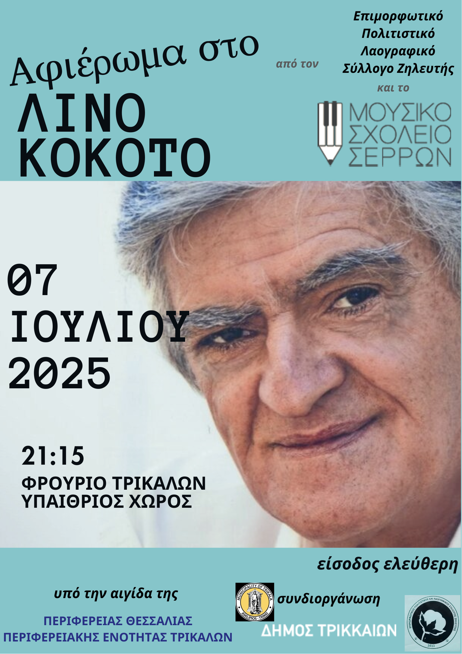 Ο μεγάλος Έλληνας συνθέτης Λίνος Κόκκοτος θα βρίσκεται στα Τρίκαλα, σε συναυλία – αφιέρωμα προς τιμή του, που τη διοργανώνει ο Επιμορφωτικός Πολιτιστικός & Λαογραφικός Σύλλογος Ζηλευτής -υπό την αιγίδα της Περιφέρειας Θεσσαλίας Περιφερειακής Ενότητας Τρικάλων και σε συνδιοργάνωση με τον Δήμο Τρικκαίων. Η συναυλία θα δοθεί τη Δευτέρα 7 Ιουλίου 2025 στις 21.15 στο Υπαίθριο Δημοτικό Θέατρο, στο Φρούριο.