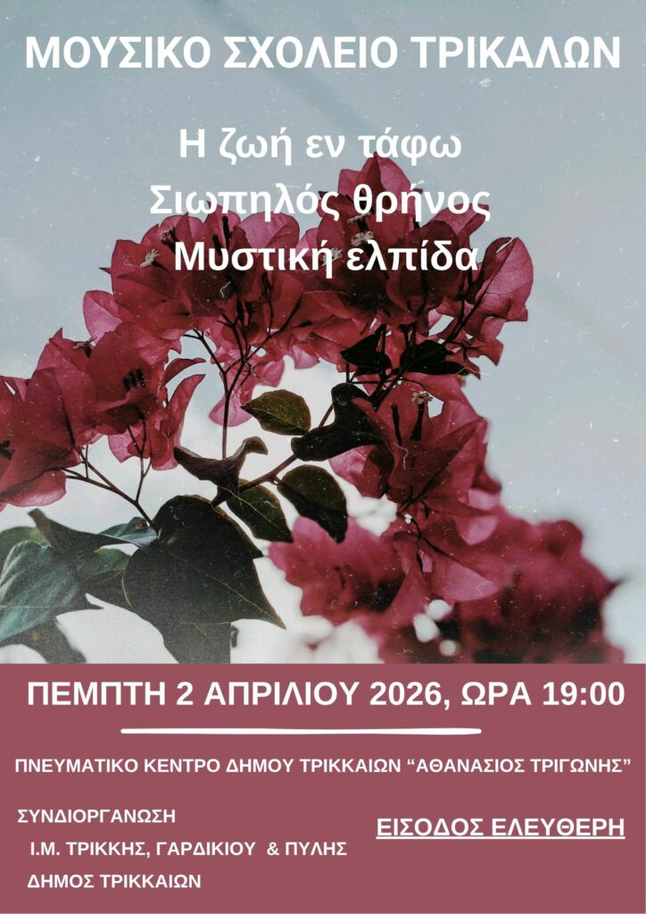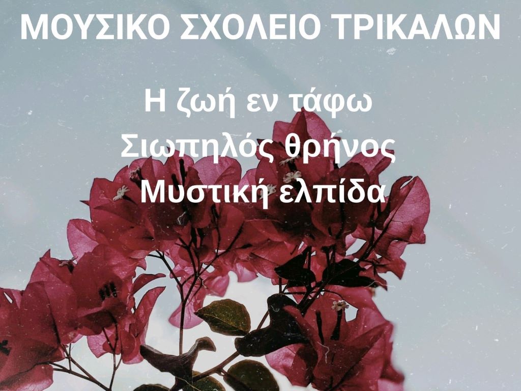 Μουσικό και ποιητικό οδοιπορικό στις πιο κατανυκτικές στιγμές της Μ. Εβδομάδας παρουσιάζει το Μουσικό Σχολείο Τρικάλων, σε συνδιοργάνωση με τον Δήμο Τρικκαίων και την Ι.Μ. Τρίκκης, Γαρδικίου και Πύλης.