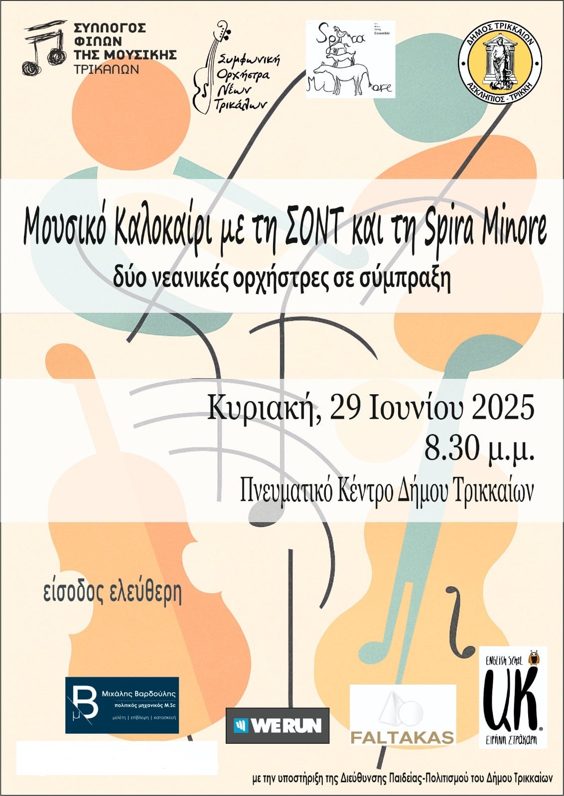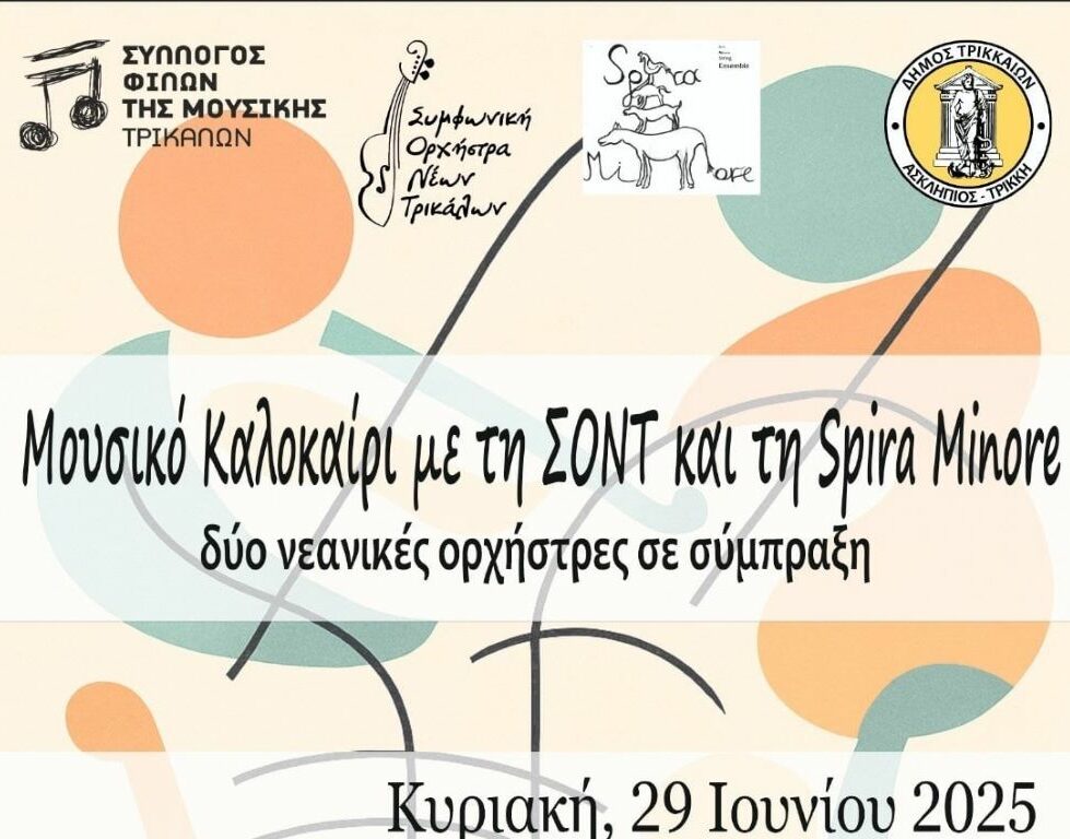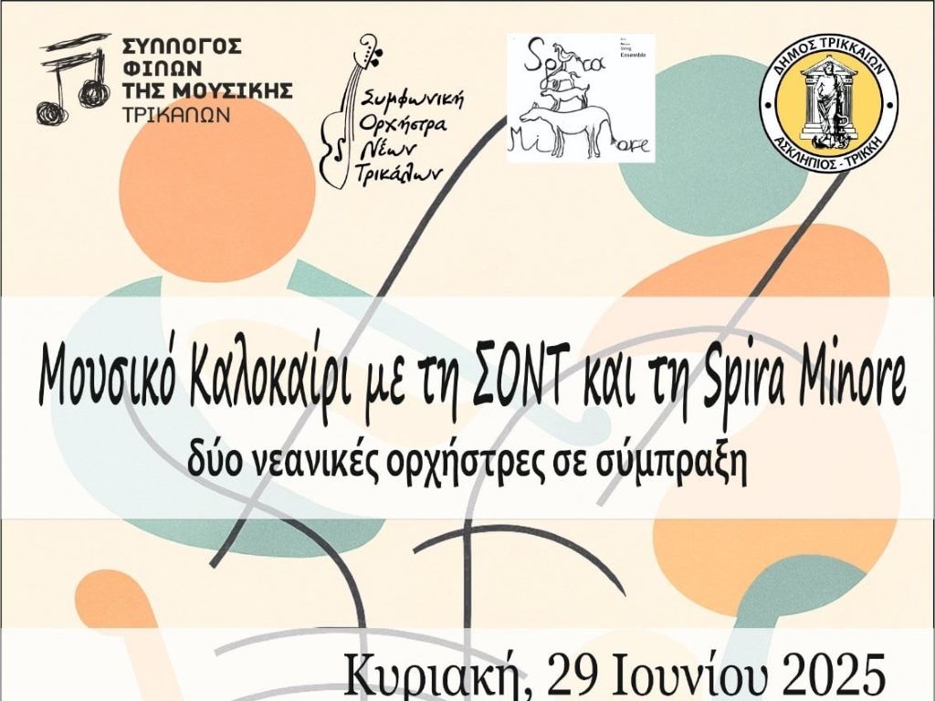 Την Κυριακή 29 Ιουνίου 2025 ώρα 8.30 μ.μ. στο Πνευματικό Κέντρο Δήμου Τρικκαίων, η ΣΟΝΤ, με μαέστρο τον Στέφανο Σεκέρογλου και η Spira Minore υπό τη διεύθυνση της Δήμητρας Κατιώνη, θα δώσουν μια μοναδική συναυλία που θα αγκαλιάσει πολλά είδη μουσικής, του κλασικού και του σύγχρονου ρεπερτορίου, με έργα σπουδαίων ξένων και Ελλήνων συνθετών της κλασικής, κινηματογραφικής αλλά και παραδοσιακής μουσικής.