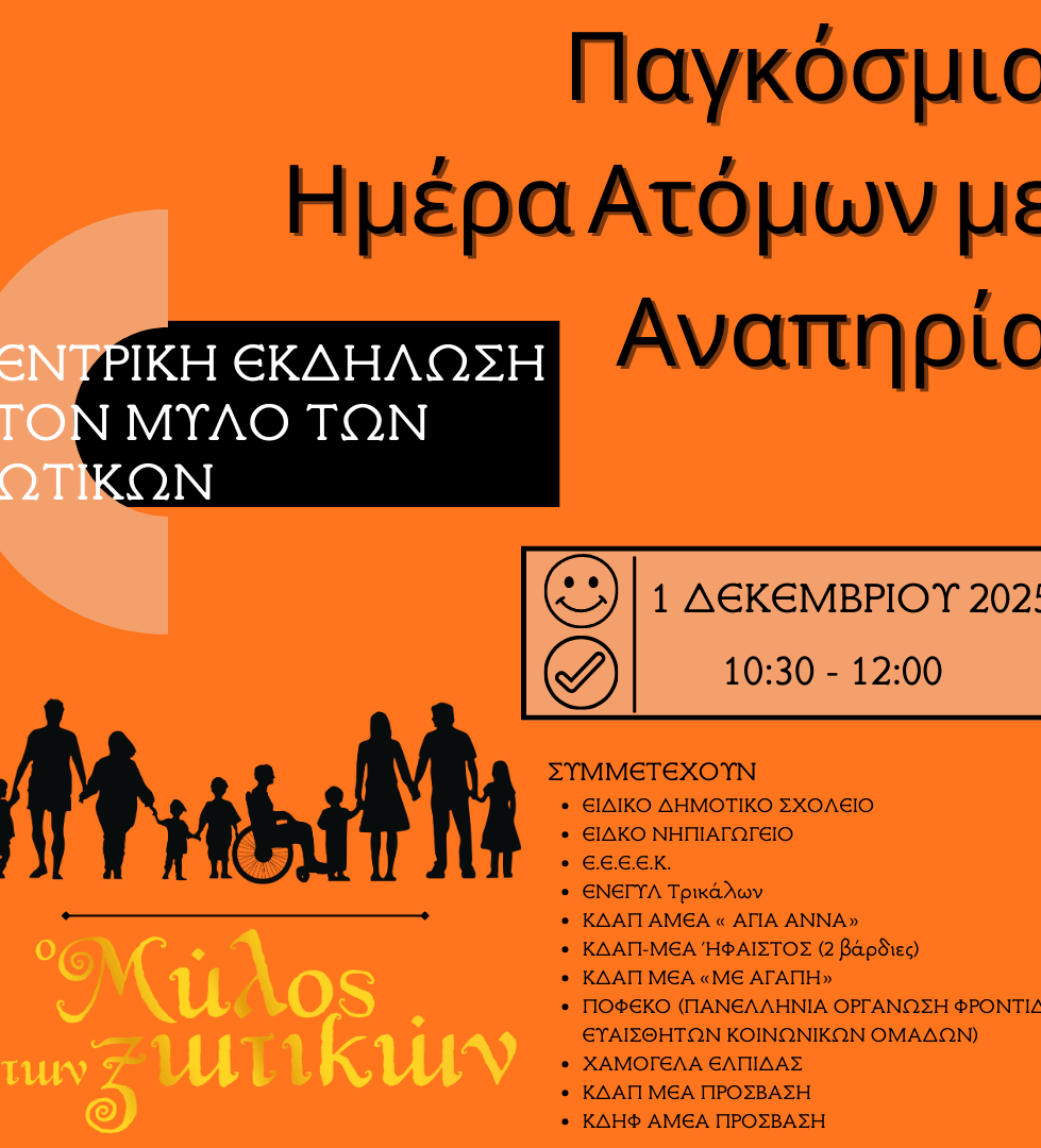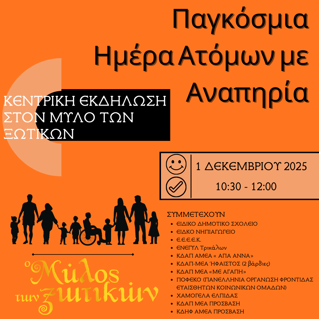 O Μύλος των Ξωτικών με αφορμή την Παγκόσμια Ημέρα Ατόμων με Αναπηρία, που γιορτάζεται παγκόσμια στις 3 Δεκεμβρίου, διοργανώνει μια μεγάλη γιορτή την Δευτέρα 1 Δεκεμβρίου 2025. Καλεί τα Ειδικά Σχολεία και τα ΚΔΑΠ της Πόλης να ενώσουν τις φωνές τους και να στείλουν όλοι μαζί ένα μήνυμα αλληλεγγύης και αλληλοσεβασμού.