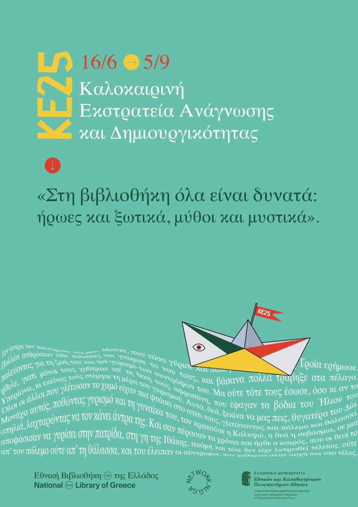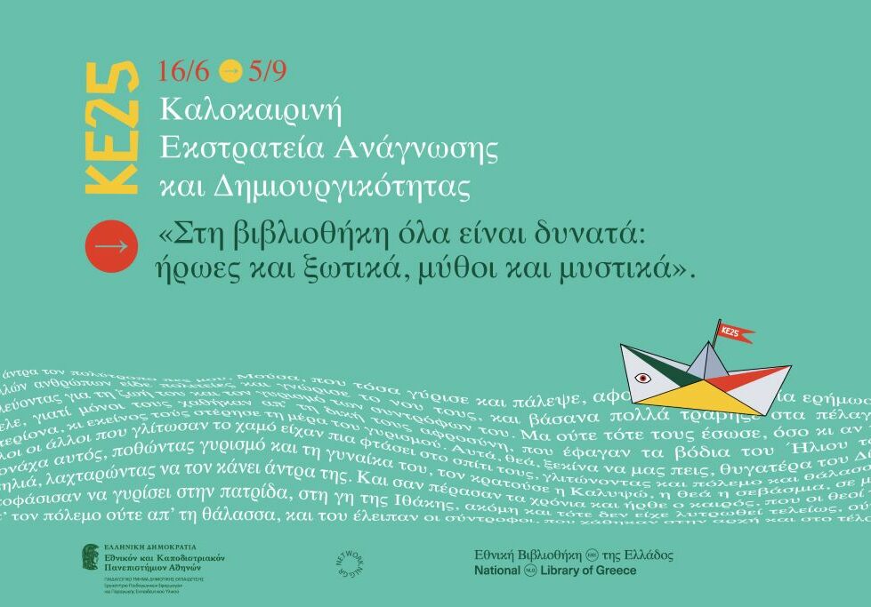 Η Καλοκαιρινή Εκστρατεία Ανάγνωσης και Δημιουργικότητας 2025 διοργανώνεται από την Εθνική Βιβλιοθήκη της Ελλάδος και υλοποιείται χάρη στην αγαστή συνεργασία της ΕΒΕ και του Εργαστηρίου Παιδαγωγικών Εφαρμογών και Παραγωγής Εκπαιδευτικού Υλικού, του Παιδαγωγικού Τμήματος Δημοτικής Εκπαίδευσης του ΕΚΠΑ (Διευθυντής: Καθηγητής Κωνσταντίνος Δ. Μαλαφάντης).