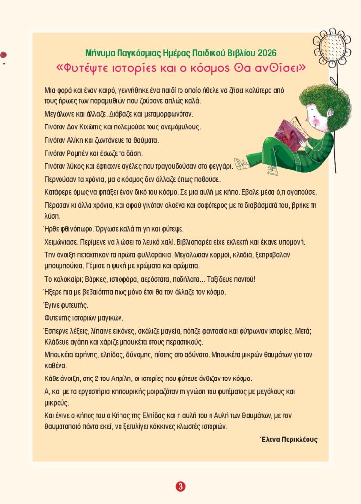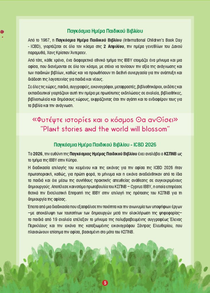 Φέτος το κεντρικό μήνυμα είναι «Φυτέψτε ιστορίες και ο κόσμος θα ανθίσει», με τιμώμενη χώρα την Κύπρο. Το μήνυμα της Κύπρου για την Παγκόσμια Ημέρα Παιδικού Βιβλίου 2026 είναι το ακόλουθο: