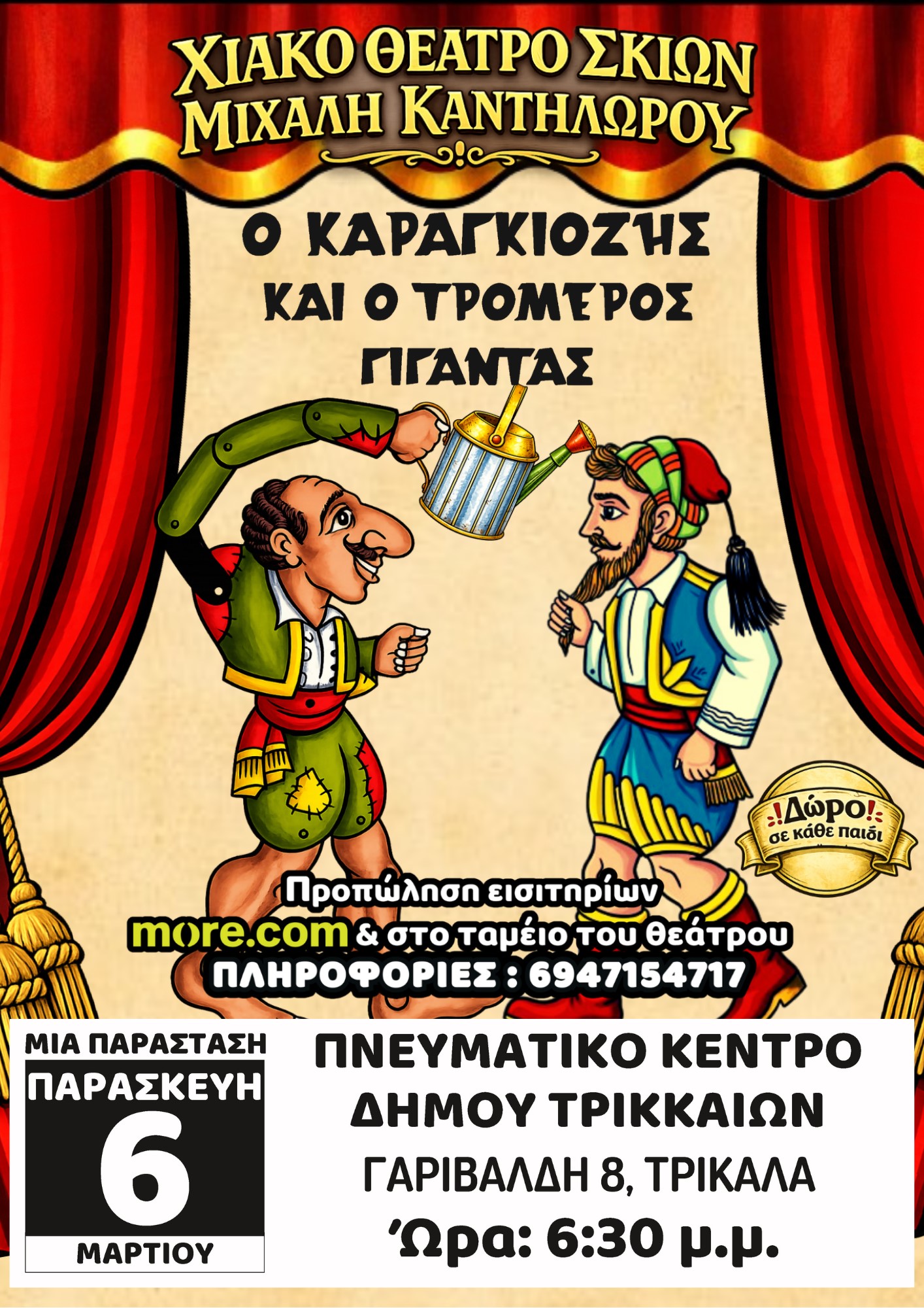Ο Καραγκιόζης και ο Τρομερός Γίγαντας παρουσιάζεται την ΠΑΡΑΣΚΕΥΗ 6 ΜΑΡΤΙΟΥ στο ΠΝΕΥΜΑΤΙΚΟ ΚΕΝΤΡΟ Δήμου Τρικκαίων «Αθανάσιος Τριγώνης».