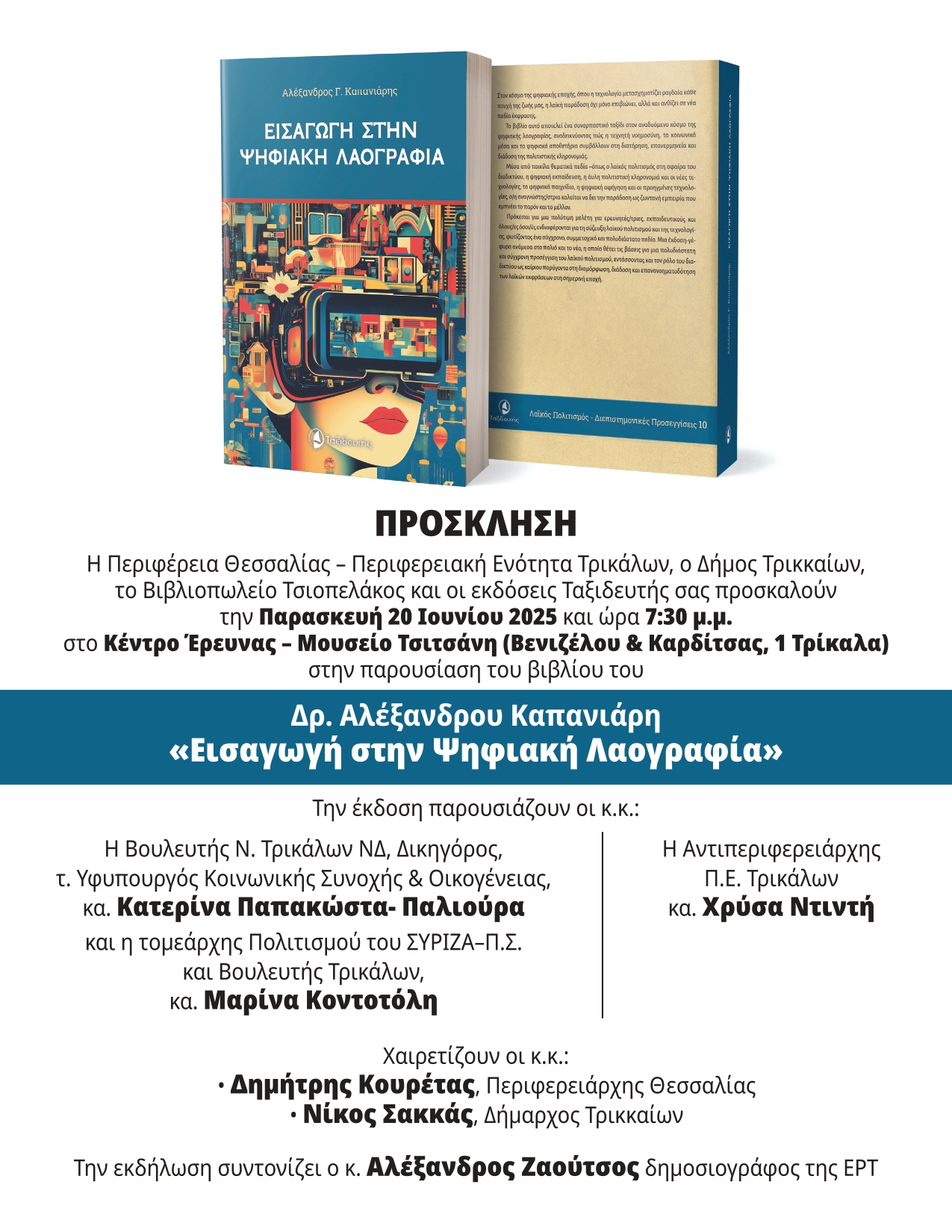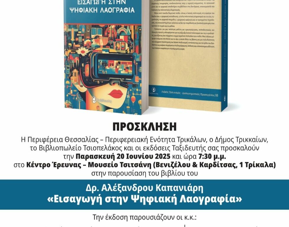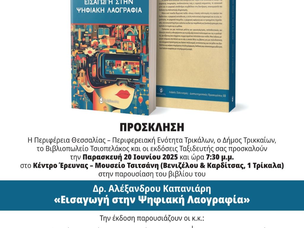Η Περιφέρεια Θεσσαλίας – Περιφερειακή Ενότητα Τρικάλων και ο Δήμος Τρικκαίων, σε συνεργασία με τις Εκδόσεις Ταξιδευτής και το Βιβλιοπωλείο Τσιοπελάκος, προσκαλούν το κοινό στην παρουσίαση της νέας επιστημονικής έκδοσης του διδάκτορα λαογραφίας και Διευθυντή Δευτεροβάθμιας Εκπαίδευσης Τρικάλων, Αλέξανδρου Καπανιάρη, με τίτλο: «Εισαγωγή στην Ψηφιακή Λαογραφία». Η παρουσίαση θα πραγματοποιηθεί την Παρασκευή 20 Ιουνίου 2025, στις 7:30 μ.μ., στο Μουσείο Τσιτσάνη.