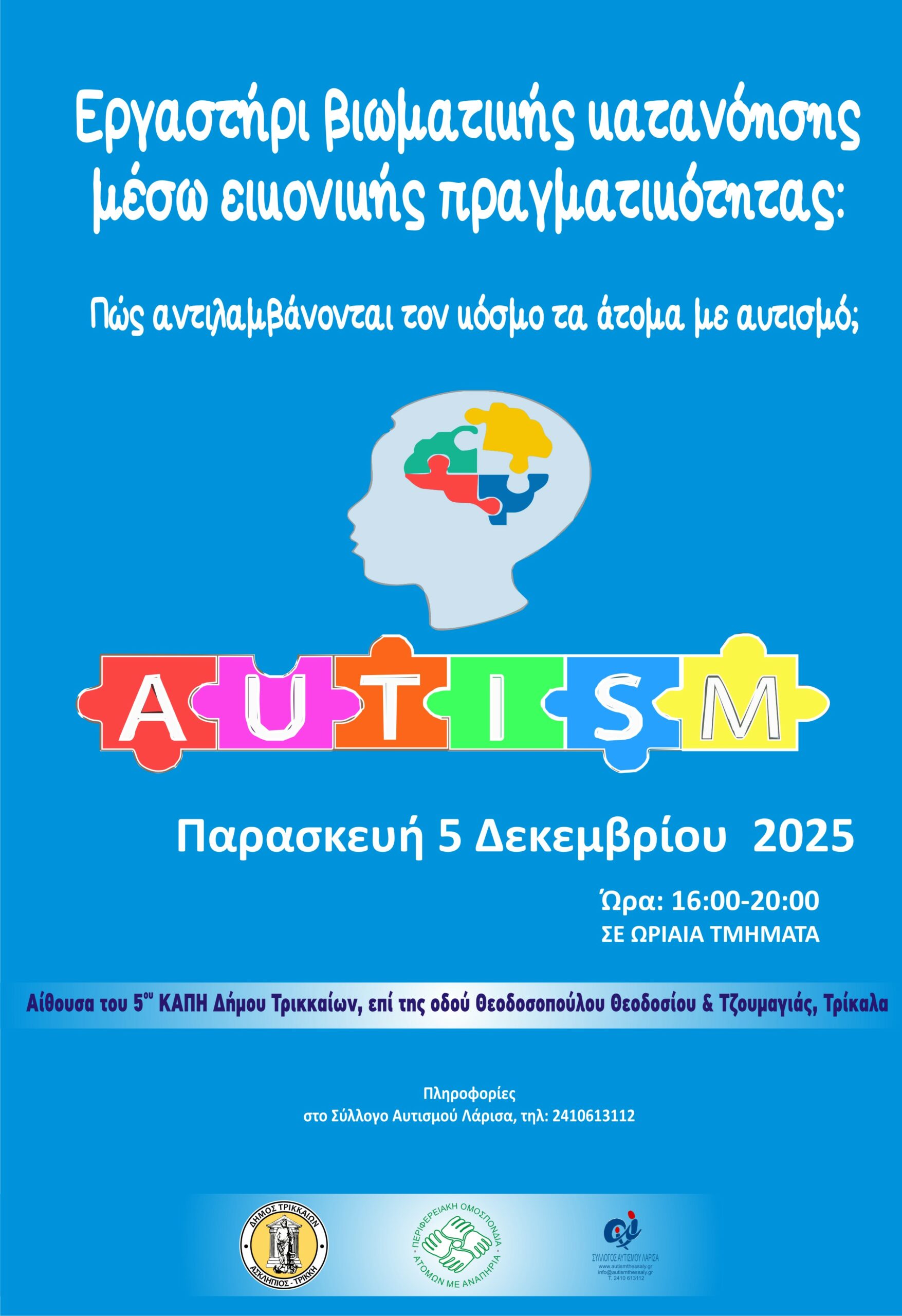 Η Περιφερειακή Ομοσπονδία Ατόμων με Αναπηρία (Π.ΟΜ.ΑμεΑ) Θεσσαλίας,  σε συνεργασία με τον Δήμο Τρικκαίων και τον Σύλλογο Αυτισμού Λάρισας, διοργανώνουν Εργαστήρι βιωματικής κατανόησης του τρόπου που τα άτομα στο φάσμα του αυτισμού αντιλαμβάνονται τον κόσμο, μέσω της αξιοποίησης των νέων τεχνολογιών εικονικής πραγματικότητας (VR).