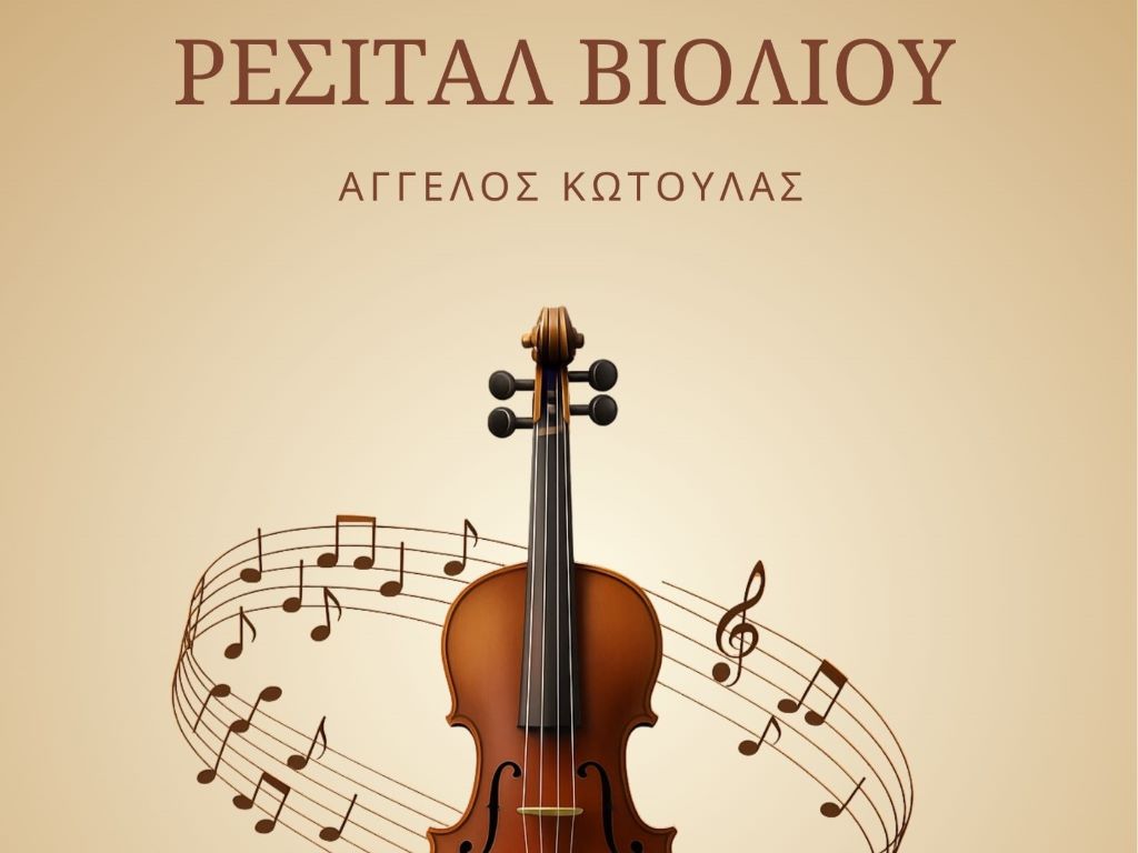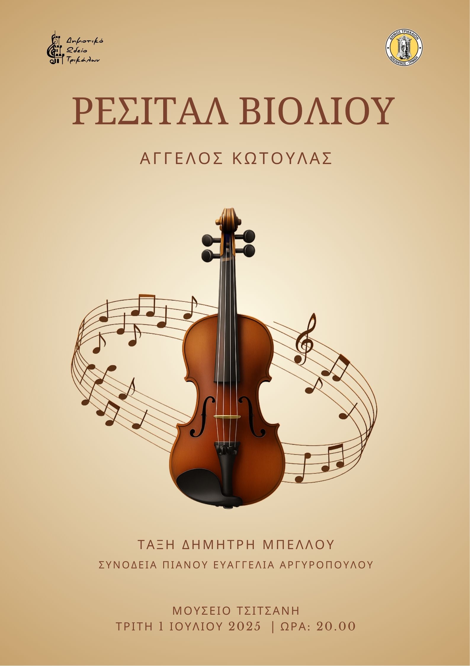 Πτυχιακό ρεσιτάλ βιολιού του Άγγελου Κωτούλα θα δοθεί στο Μουσείο Τσιτσάνη, την Τρίτη 1 Ιουλίου 2025. Πρόκειται για μαθητή της τάξης του καθηγητή του ΔΩΤ κ. Δημήτρη Μπέλλου. Στη συνοδεία πιάνου η κ. Ευαγγελία Αργυροπούλου.