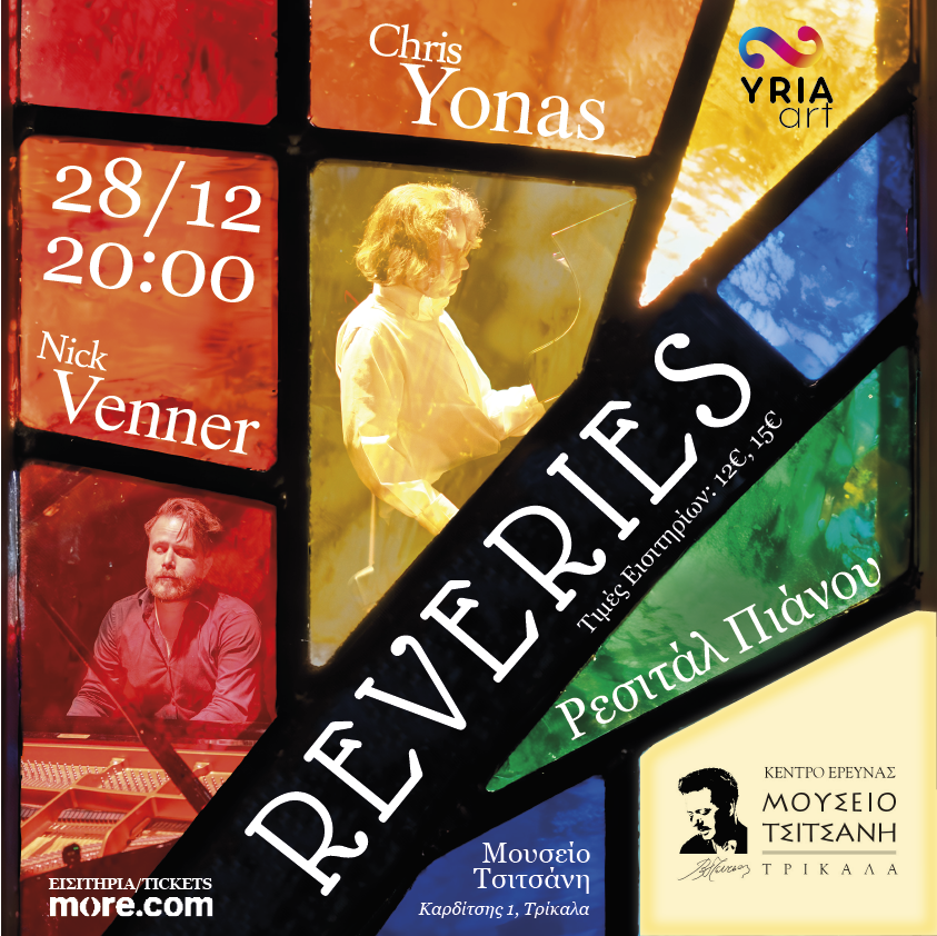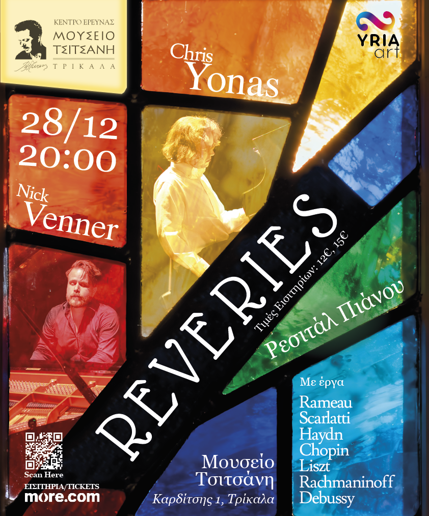 Η YRIART σε συνεργασία με το Μουσείο Τσιτσάνη παρουσιάζει για πρώτη φορά εκτός Αθηνών το επιτυχημένο ρεσιτάλ πιάνου «REVERIES» με τους διακεκριμένους και βραβευμένους από την Ακαδημία Αθηνών πιανίστες, Νίκο Βέννερ και Χρήστο Γιώνα. Στον σύγχρονο συναυλιακό χώρο του Μουσείου Τσιτσάνη στα Τρίκαλα, οι δύο καλλιτέχνες θα ερμηνεύσουν έργα εμβληματικών συνθετών, προσφέροντας ένα ταξίδι στην προκλασική, ρομαντική και μετα-ρομαντική μουσική παράδοση.