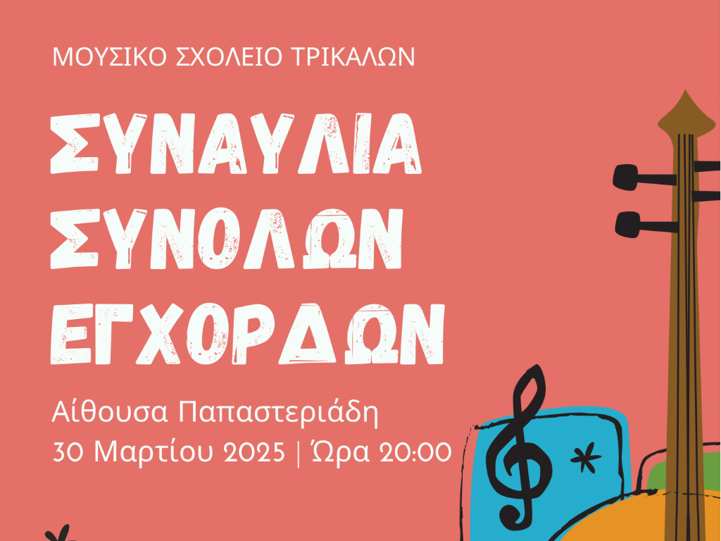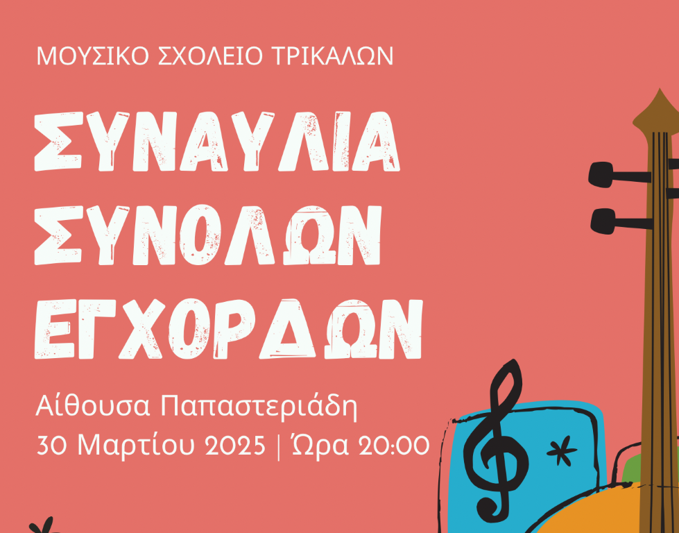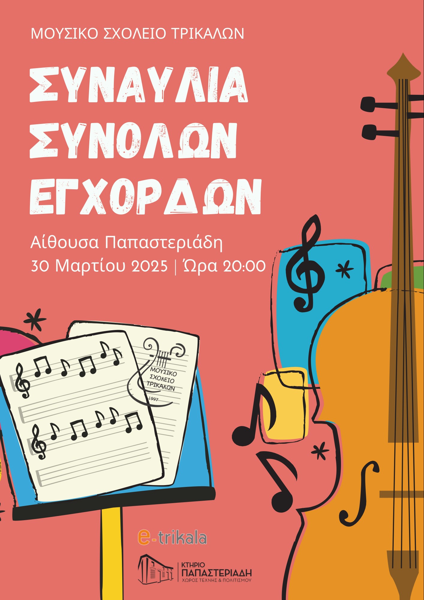 Την Κυριακή 30 Μαρτίου, στις 20:00, το Μουσικό Σχολείο Τρικάλων διοργανώνει ξεχωριστή μουσική βραδιά στο Κτήριο Παπαστεριάδη. Τα Σύνολα Εγχόρδων του Μουσικού Σχολείου Τρικάλων θα παρουσιάσουν ένα πρόγραμμα γεμάτο μελωδίες που αναδεικνύουν την ομορφιά των εγχόρδων και το ταλέντο των μαθητών.