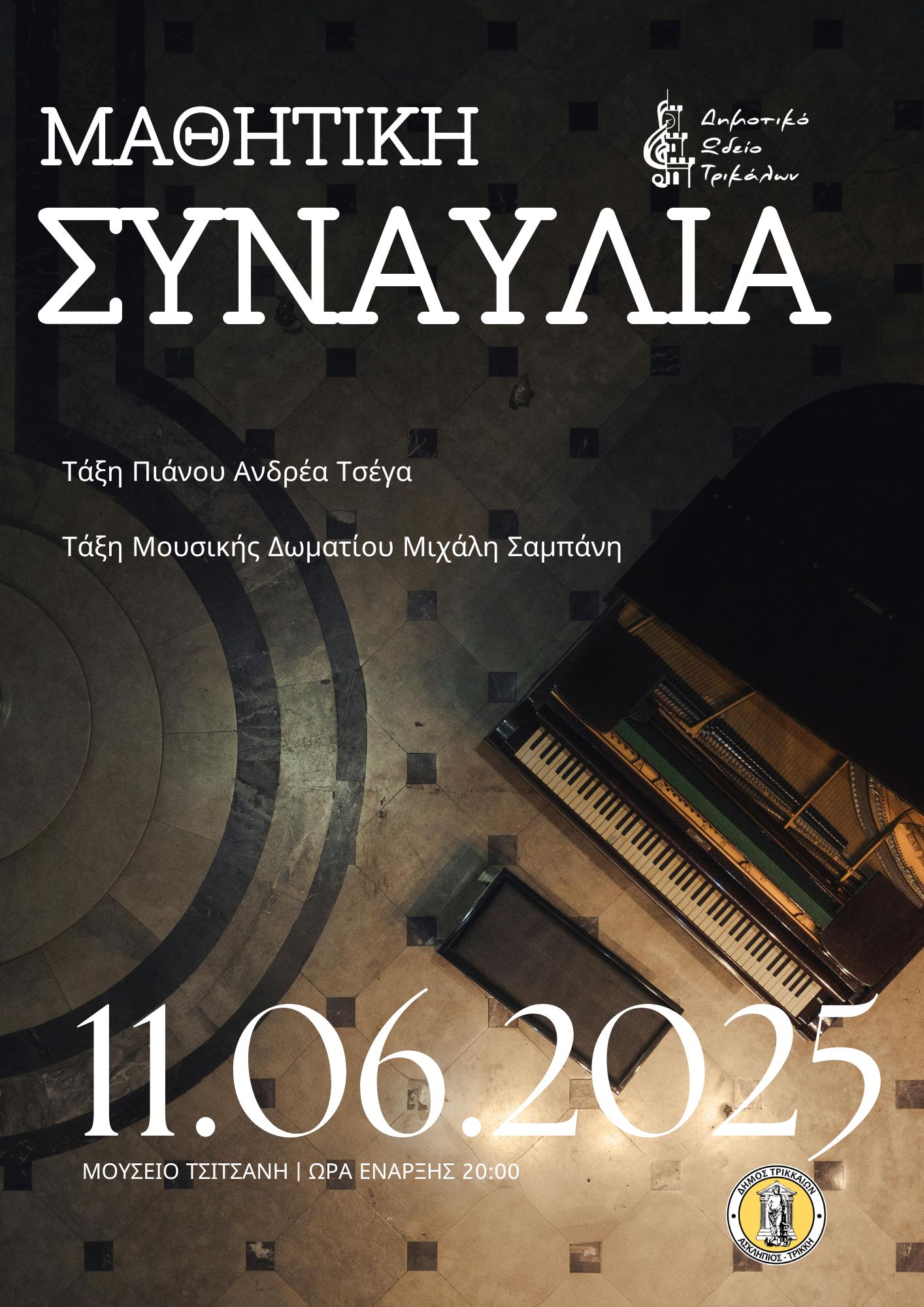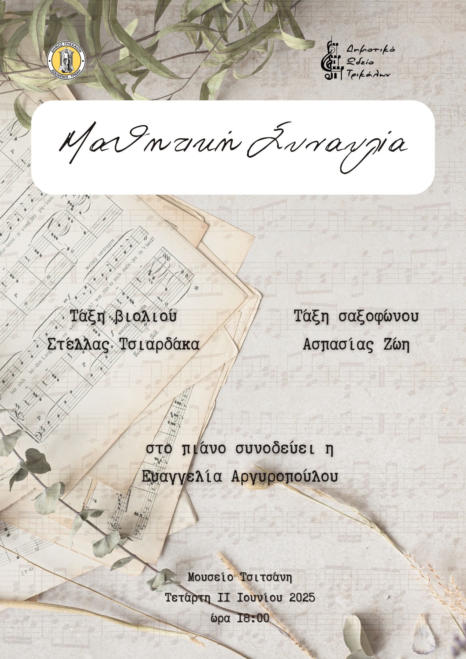 Δύο συναυλίες μαθητών/τριών του διοργανώνει το Δημοτικό Ωδείο Τρικάλων. Αμφότερες θα δοθούν στις 11 Ιουνίου 2025, στο Μουσείο Τσιτσάνη: