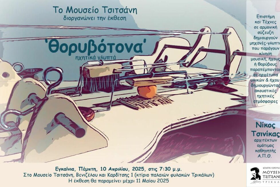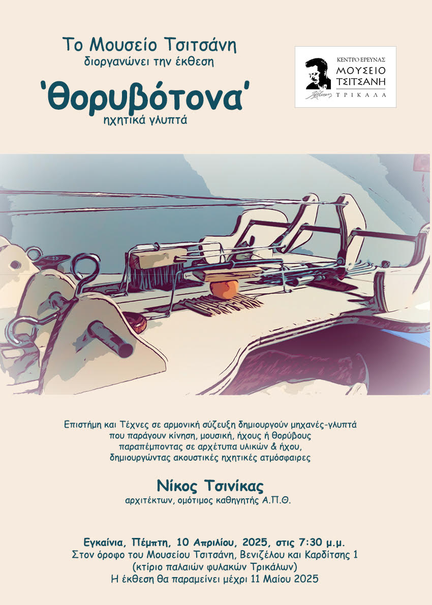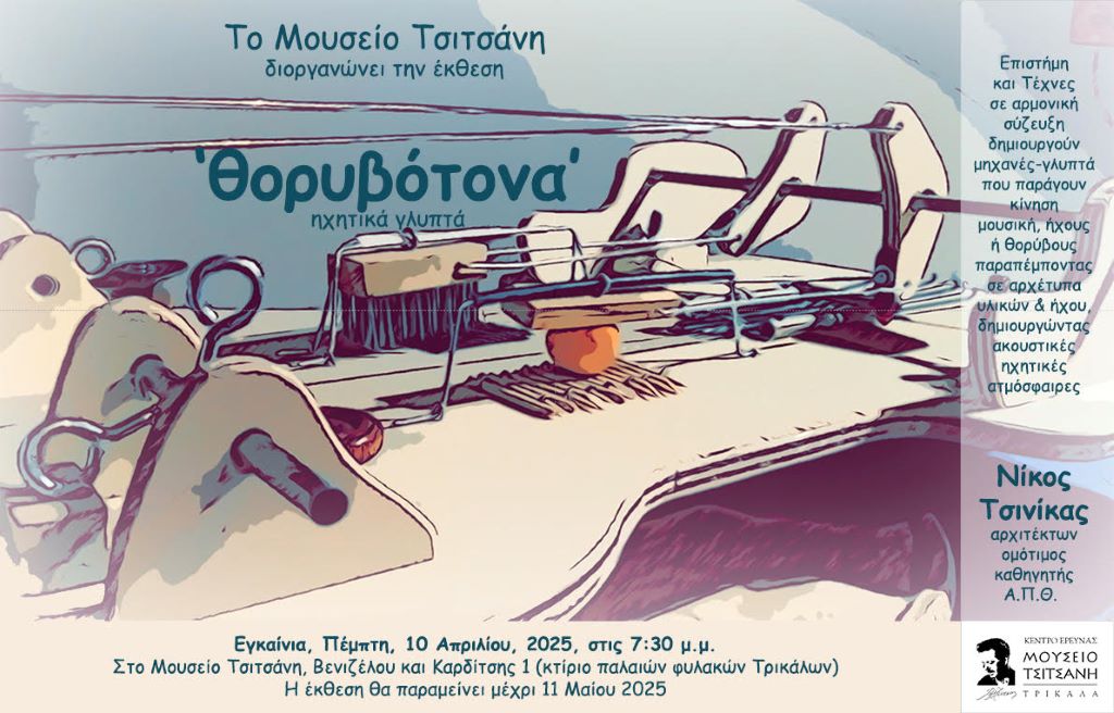 Μια ξεχωριστή έκθεση εγκαινιάζεται στο Μουσείο Τσιτσάνη. Πρόκειται για την έκθεση «θορυβότονα», που αποτελείται από ηχητικά – κινητικά γλυπτά, τα οποία δημιούργησε ο Νίκος Τσινίκας, ομότιμος καθηγητής στο Τμήμα Αρχιτεκτόνων του ΑΠΘ.