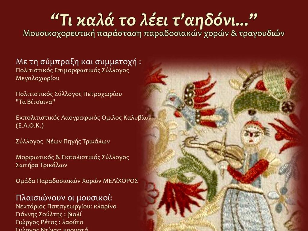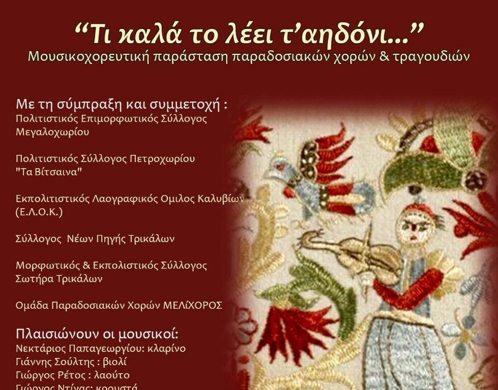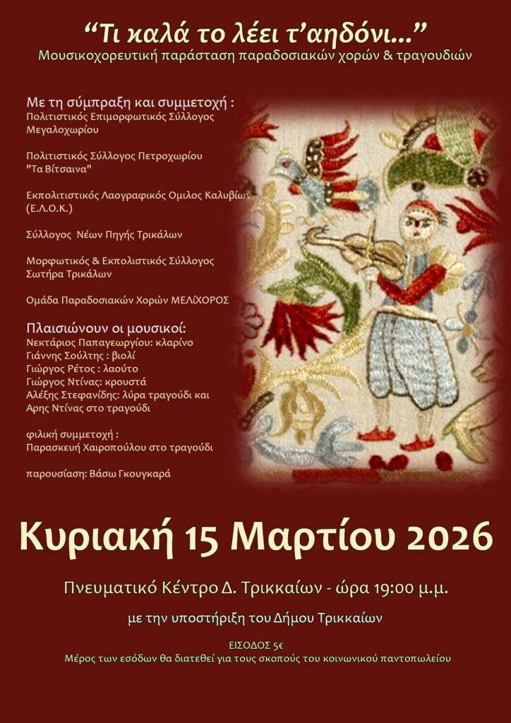 Την Κυριακή 15 Μαρτίου 2026 και ώρα 19:00 μ.μ. θα πραγματοποιηθεί στο Πνευματικό Κέντρο Δ. Τρικκαίων “Αθανάσιος τριγώνης μουσικοχορευτική παράσταση παραδοσιακών χορών και τραγουδιών με τίτλο «Τι καλά το λέει τ’ αηδόνι…». Πρόκειται για τη σύμπραξη και συμμετοχή έξι συλλόγων της περιοχής μας και ειδικότερα του Πολιτιστικού Επιμορφωτικού Συλλόγου Μεγαλοχωρίου, του Πολιτιστικού Συλλόγου Πετροχωρίου “Τα Βίτσαινα”, του Εκπολιτιστικού Λαογραφικού Ομίλου Καλυβίων (Ε.Λ.Ο.Κ.), του Συλλόγου Νέων Πηγής Τρικάλων, του Μορφωτικού & Εκπολιστικού Συλλόγου Σωτήρα Τρικάλων και της Ομάδας Παραδοσιακών Χορών ΜΕΛίΧΟΡΟΣ. Η εκδήλωση πραγματοποιείται με τη στήριξη του Δήμου Τρικκαίων και έχει φιλανθρωπικό χαρακτήρα, καθώς μέρος των εισόδων θα διατεθεί για τους σκοπούς του κοινωνικού παντοπωλείου. Είσοδος 5€.