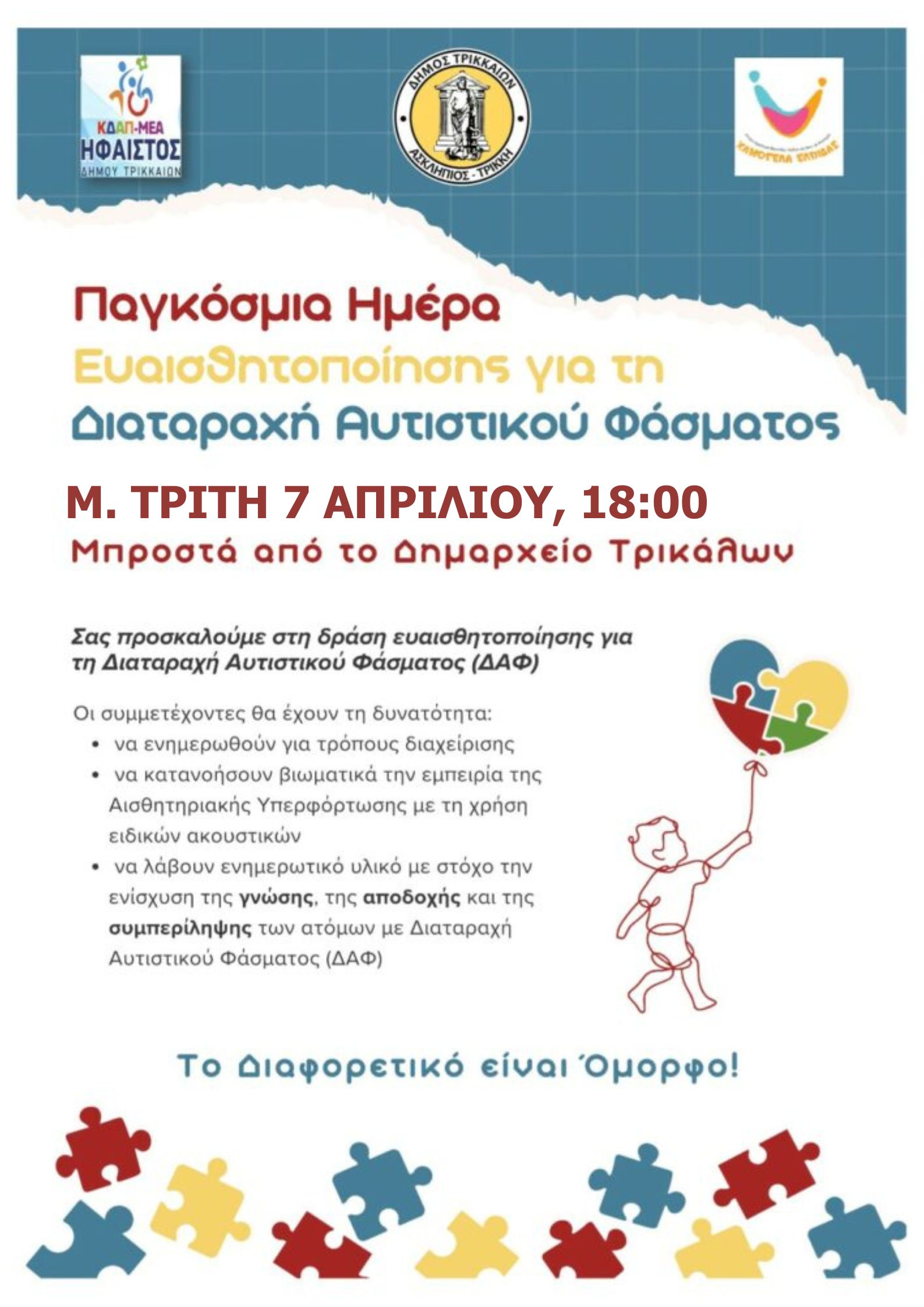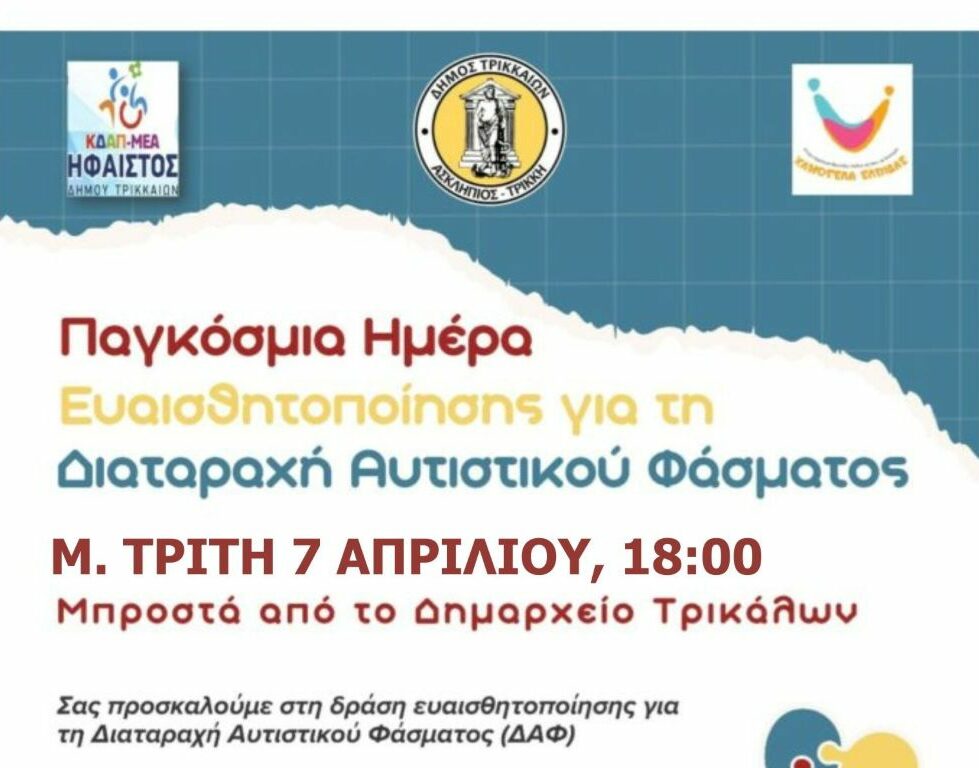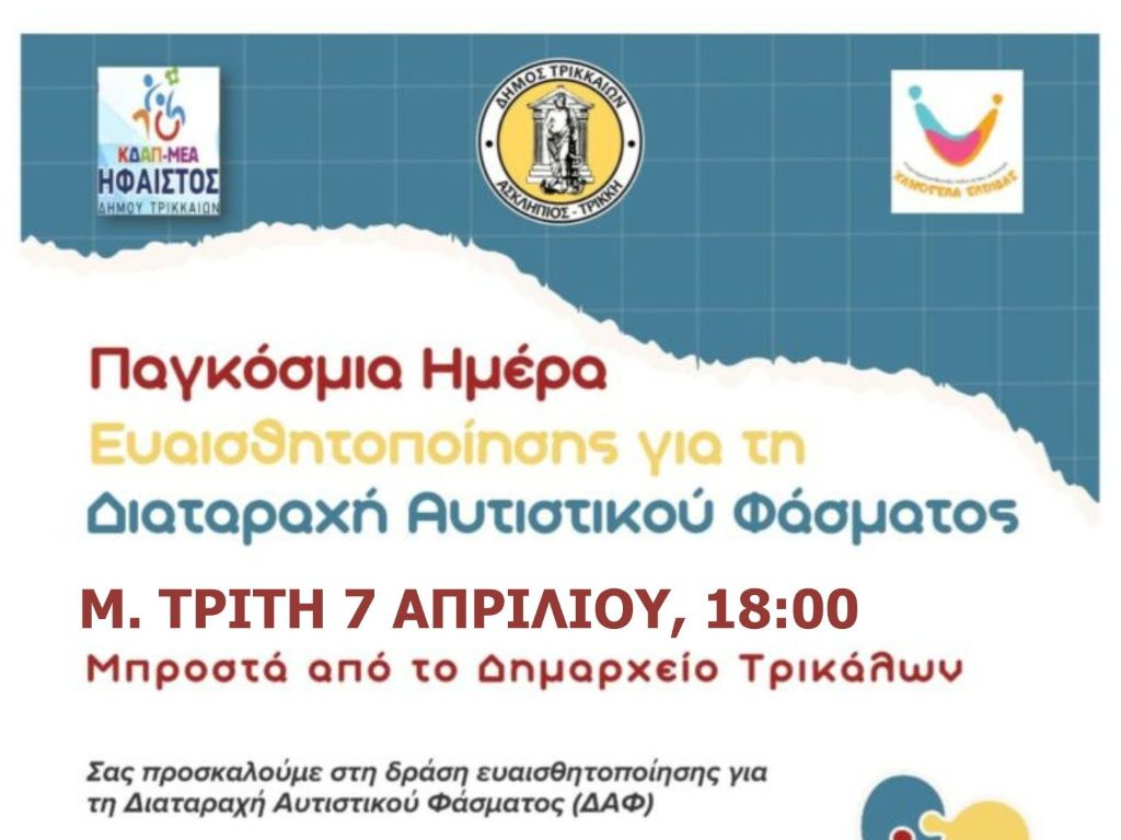 Για τη Μ. Τρίτη 7 Απριλίου 2026 μεταφέρθηκε η εκδήλωση για τον Αυτισμό, που συνδιοργανώνουν το ΚΔΑΠ-ΜΕΑ ΗΦΑΙΣΤΟΣ του Δήμου Τρικκαίων (β΄ βάρδια), σε συνεργασία με το ΚΔΗΦ «Χαμόγελα Ελπίδας». Η κοινή δράση θα πραγματοποιηθεί στις 6 το απόγευμα, μπροστά από το Δημαρχείο Τρικκαίων.