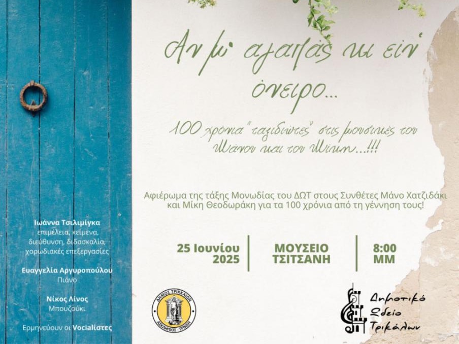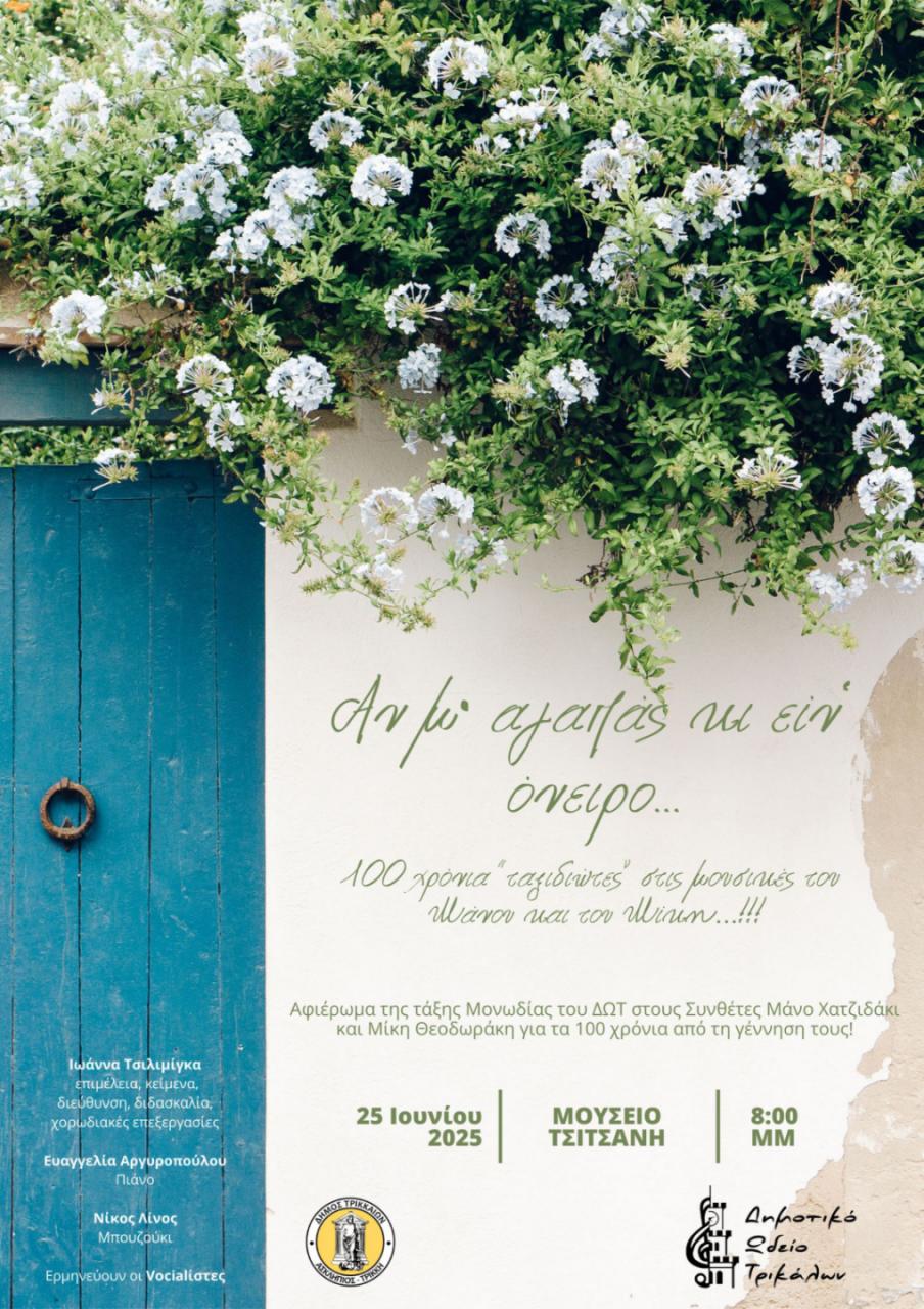 Ο Μάνος και ο Μίκης. Ο Μίκης και ο Μάνος. Ο Χατζιδάκης και ο Θεοδωράκης τιμώνται από το Δημοτικό Ωδείο Τρικάλων. Η τεράστια προσφορά των δύο τιτάνων της ελληνικής μουσικής αποτυπώνεται σε ειδικό αφιέρωμα που ετοίμασε το τμήμα Μονωδίας του Ωδείου, με αφορμή τα 100 χρόνια από τη γέννησή τους. Η εκδήλωση φέρει τον χαρακτηριστικό τίτλο “Αν μ’ αγαπάς κι ειν’ όνειρο” και θα πραγματοποιηθεί την Τετάρτη 25 Ιουνίου 2025, στις 20:00, στην αίθουσα εκδηλώσεων του Μουσείου Τσιτσάνη. Η επιμέλεια, τα κείμενα, η διδασκαλία, η διεύθυνση και οι χορωδιακές επεξεργασίες ανήκουν στην καθηγήτρια της τάξης μονωδίας κ. Ιωάννα Τσιλιμίγκα. Ερμηνεύουν οι Vocialίστες, με τη συνοδεία των καθηγητών του ΔΩΤ κ.κ. Ευαγγελίας Αργυροπούλου και Νίκου Λϊνου σε πιάνο και μπουζούκι αντιστοίχως.
