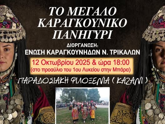Μετά την αναβολή, που είχε ανακοινωθεί λόγω καιρού, το Μεγάλο Καραγκούνικο Πανηγύρι, η μεγάλη γιορτή της παράδοσης και της πολιτιστικής κληρονομιάς των Καραγκούνηδων, επιστρέφει δυναμικά. Η Ένωση Καραγκούνηδων Ν. Τρικάλων καλεί όλο τον κόσμο σε μια γιορτή παράδοσης και πολιτισμού, την Κυριακή 12 Οκτωβρίου 2025, στις 18:00, στο προαύλιο του 1ου Λυκείου στην Μπάρα Τρικάλων.
