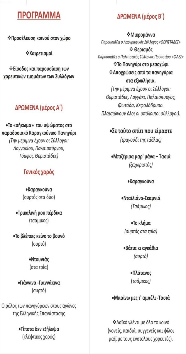 Το πρόγραμμα περιλαμβάνει παραδοσιακούς χορούς, μουσική, ποικίλες πολιτιστικές δράσεις και φυσικά την ξακουστή παραδοσιακή φιλοξενία (καζάνι), που αποτελεί σήμα κατατεθέν της καραγκούνικης κουλτούρας.