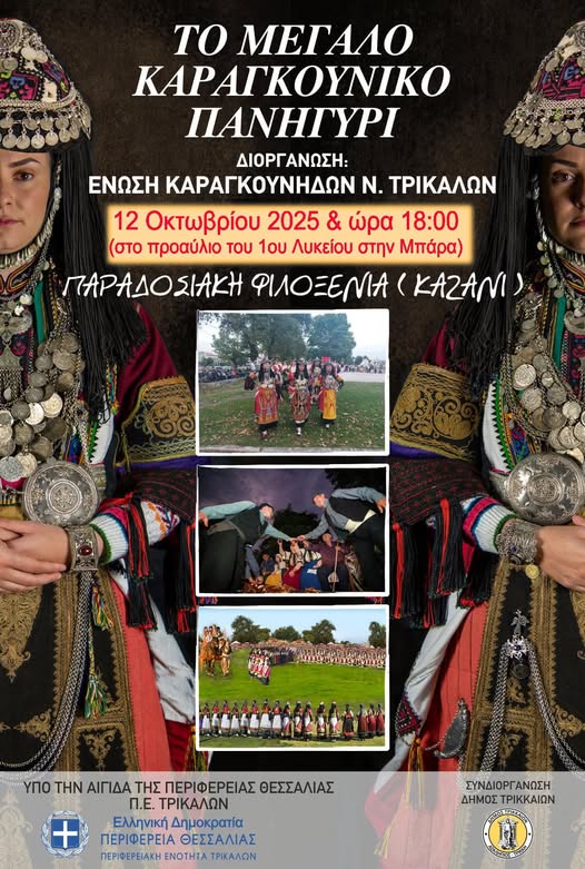 Μετά την αναβολή, που είχε ανακοινωθεί λόγω καιρού, το Μεγάλο Καραγκούνικο Πανηγύρι, η μεγάλη γιορτή της παράδοσης και της πολιτιστικής κληρονομιάς των Καραγκούνηδων, επιστρέφει δυναμικά. Η Ένωση Καραγκούνηδων Ν. Τρικάλων καλεί όλο τον κόσμο σε μια γιορτή παράδοσης και πολιτισμού, την Κυριακή 12 Οκτωβρίου 2025, στις 18:00, στο προαύλιο του 1ου Λυκείου στην Μπάρα Τρικάλων.