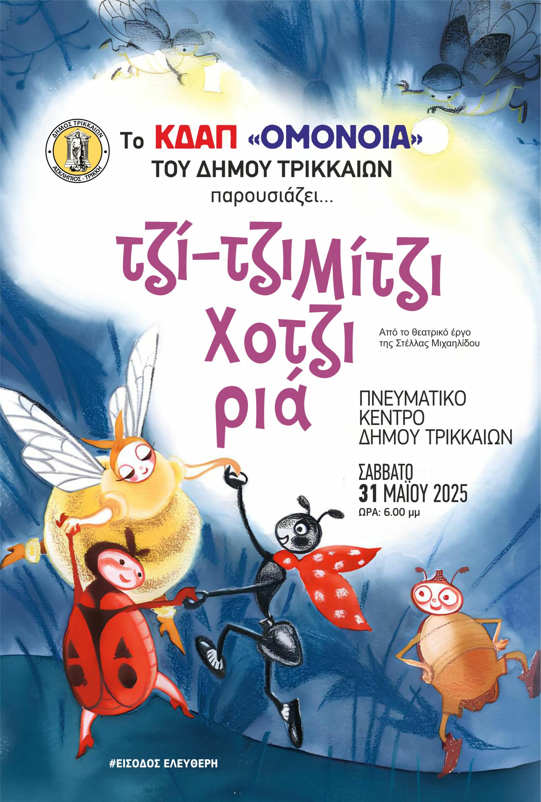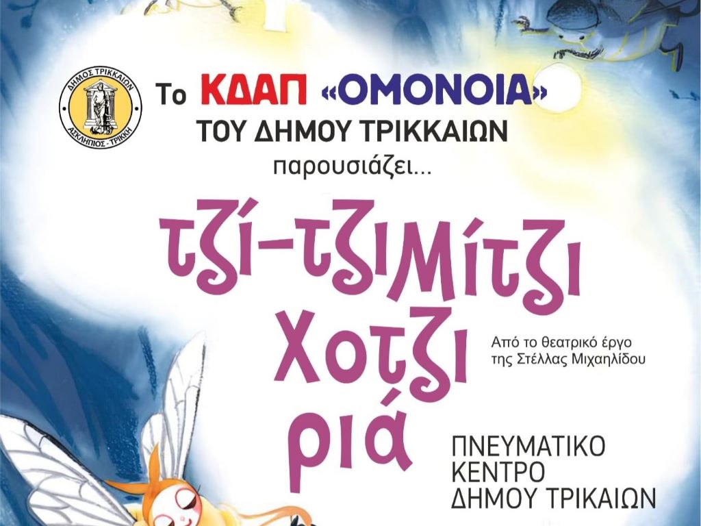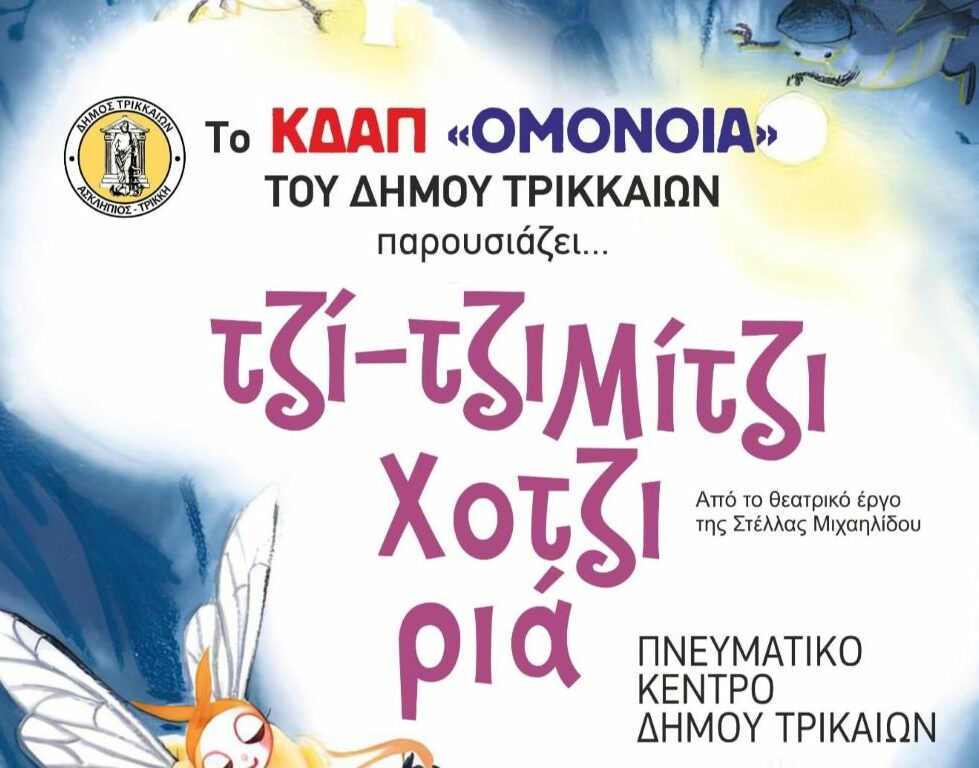 Το ΚΔΑΠ «ΟΜΟΝΟΙΑ» του Δήμου Τρικκαίων παρουσιάζει το αγαπημένο θεατρικό έργο «Τζιτζιμιτζιχοτζιριά» της Στέλλας Μιχαηλίδου, το Σάββατο 31 Μαΐου 2025 στις 18:00 στο Πνευματικό Κέντρο Δήμου Τρικκαίων «Αθανάσιος Τριγώνης». Η είσοδος είναι ελεύθερη για το κοινό.