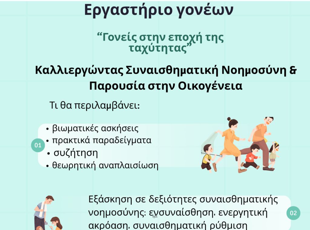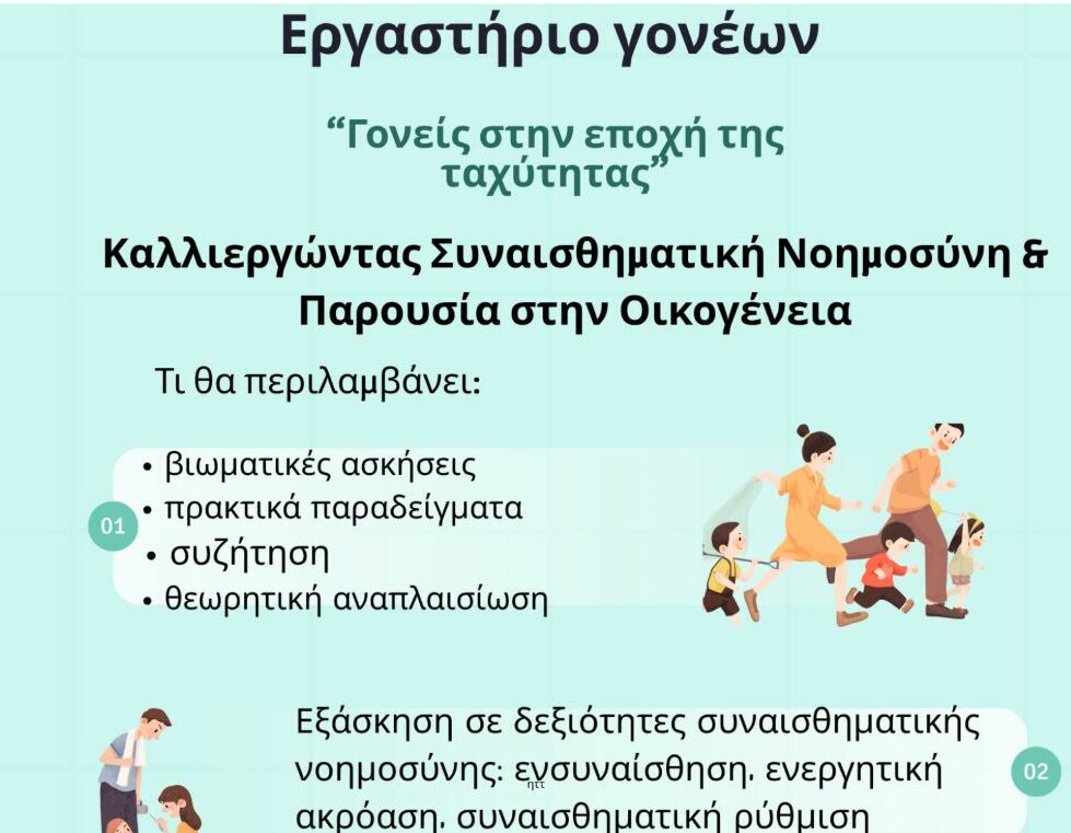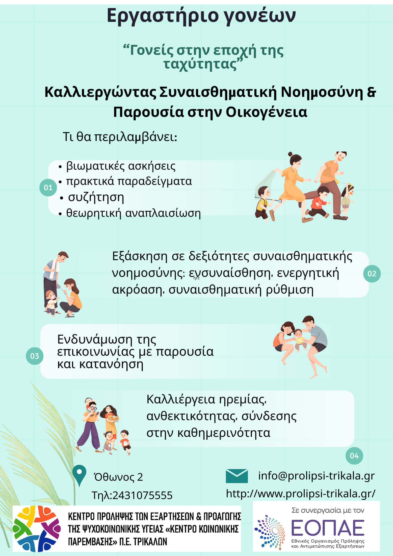 Το Κέντρο Πρόληψης των Εξαρτήσεων και Προαγωγής της Ψυχοκοινωνικής Υγείας Π.Ε. Τρικάλων, σε συνεργασία με τον ΕΟΠΑΕ, προσκαλεί γονείς και κηδεμόνες σε ένα βιωματικό εργαστήρι με τίτλο «Γονείς στην Εποχή της Ταχύτητας: Καλλιεργώντας Συναισθηματική Νοημοσύνη και Παρουσία στην Οικογένεια»