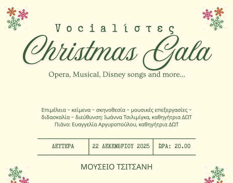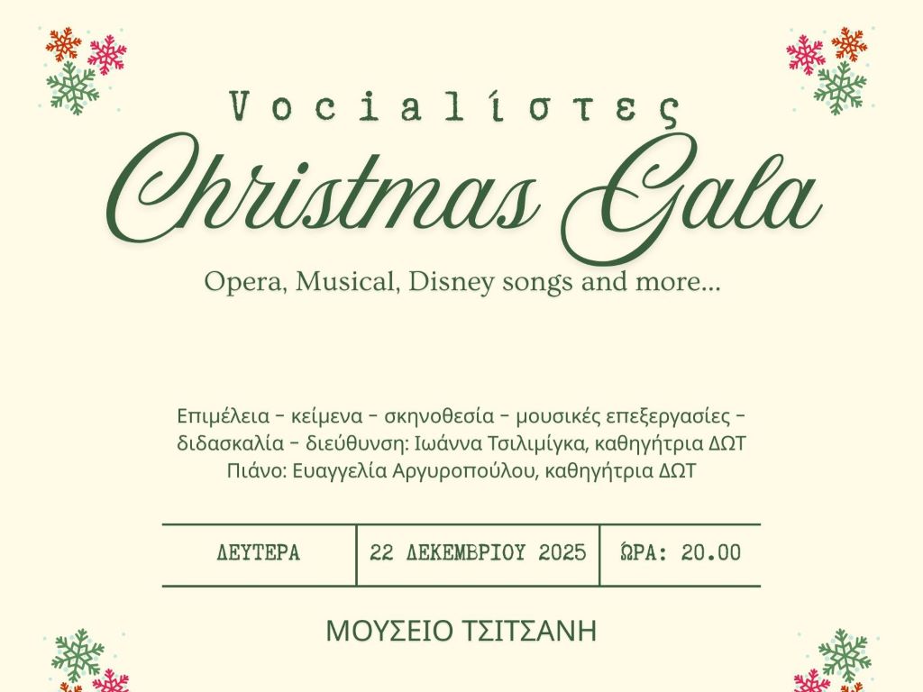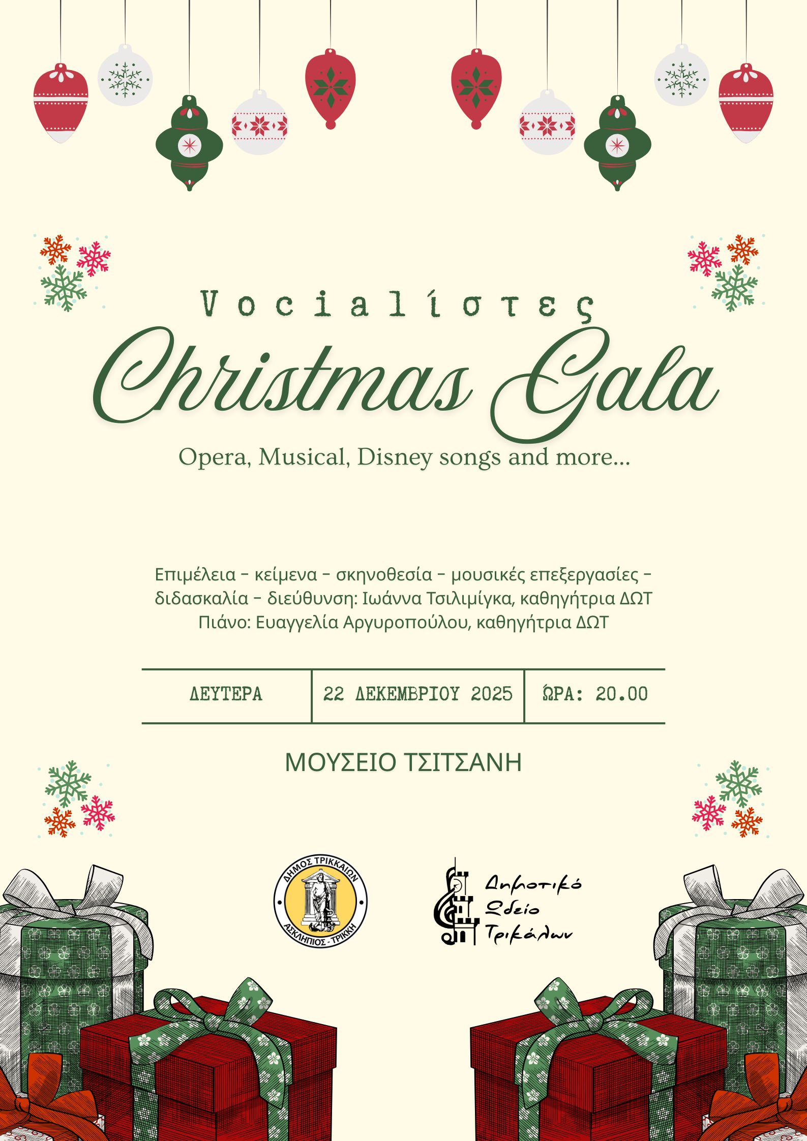 Το Δημοτικό Ωδείο Τρικάλων παρουσιάζει τη χριστουγεννιάτικη συναυλία της τάξης φωνητικής της Ιωάννας Τσιλιμίγκα με τίτλο Vocialίστες Christmas Gala. Τη Δευτέρα 22 Δεκεμβρίου 2025, στις 20:00, στο Μουσείο Τσιτσάνη, οι μαθητές της τάξης θα ερμηνεύσουν αγαπημένες μελωδίες από τον κόσμο της όπερας, του μιούζικαλ και της Disney, καθώς και κλασικές χριστουγεννιάτικες συνθέσεις, σε μια βραδιά γεμάτη φαντασία, συγκίνηση και εορταστική ατμόσφαιρα. Στο πιάνο συνοδεύει η Ευαγγελία Αργυροπούλου, καθηγήτρια του ΔΩΤ. Η είσοδος είναι ελεύθερη και το κοινό καλείται να μοιραστεί τη χαρά και τη μαγεία των Χριστουγέννων μέσα από τη δύναμη της μαθητικής δημιουργίας.