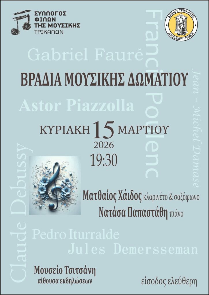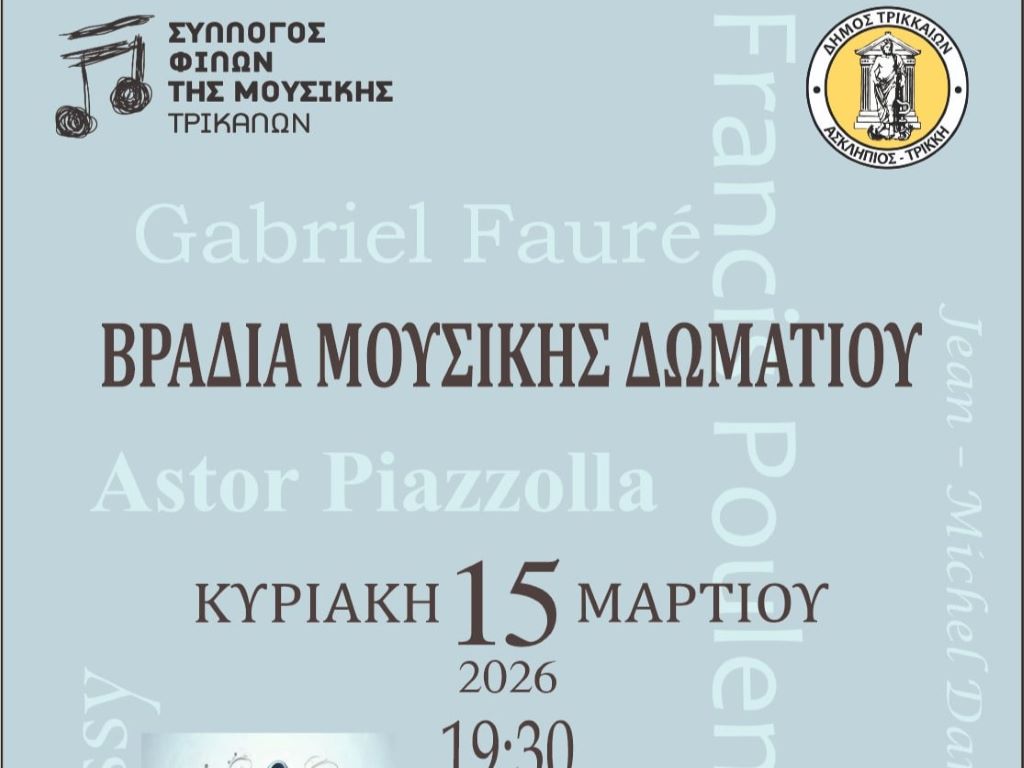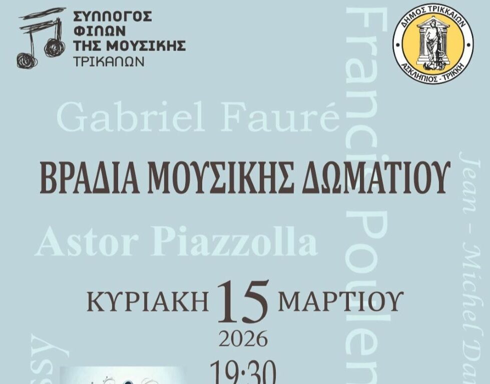 Ο Σύλλογος Φίλων της Μουσικής Τρικάλων προσκαλεί το κοινό σε μια ξεχωριστή Βραδιά Μουσικής Δωματίου, την Κυριακή 15 Μαρτίου 2026 στις 19:30, στην αίθουσα εκδηλώσεων του Μουσείου Τσιτσάνη.
