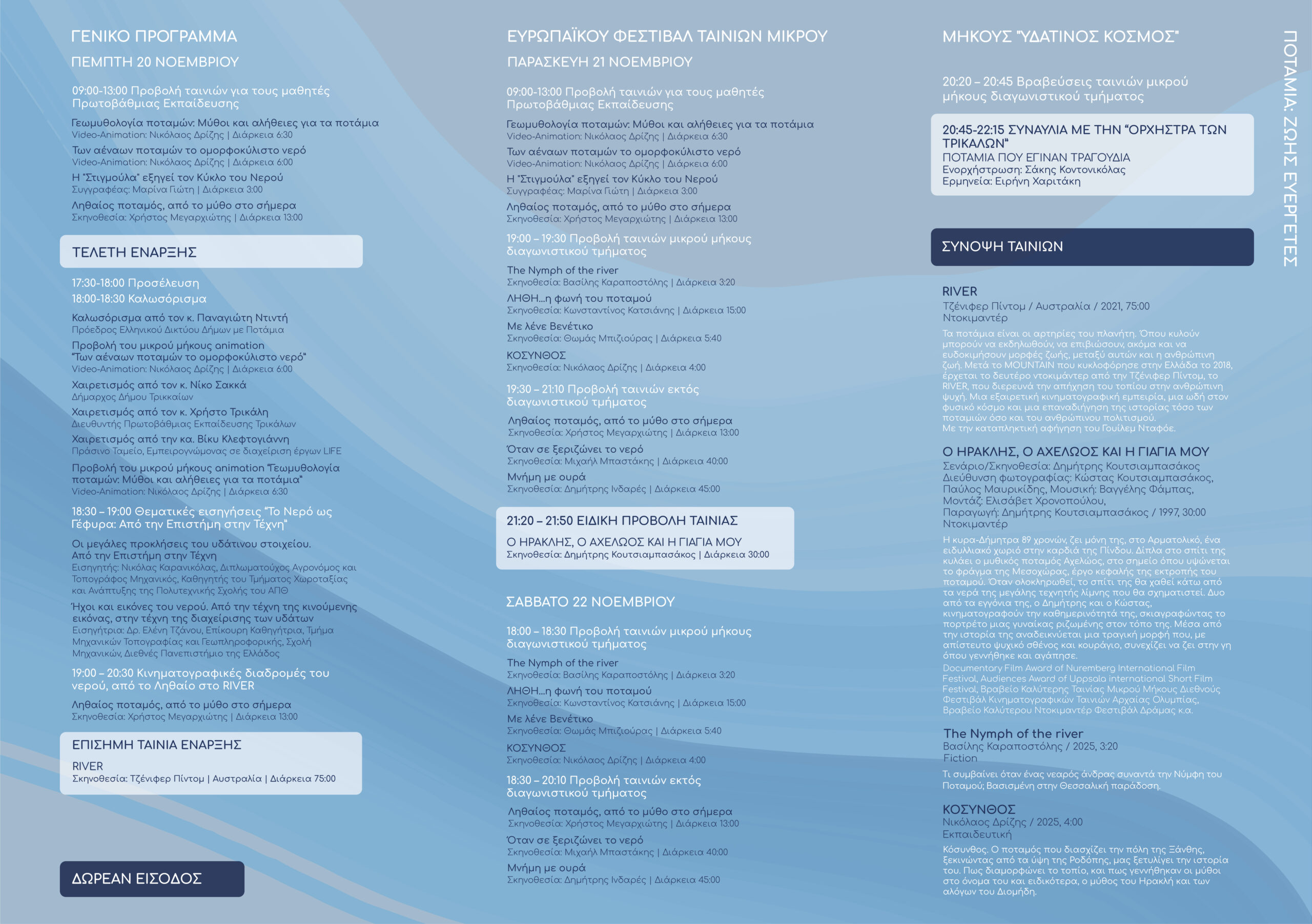Η μέρα ξεκινά με πρωινές προβολές για μαθητές και συνεχίζεται με ταινίες που εντάσσονται εντός, αλλά και εκτός διαγωνιστικού τμήματος, οι οποίες εξερευνούν την οικολογία των ποταμιών, τη σχέση των ανθρώπων με τον τόπο της, τον μύθο και τη μνήμη του νερού, της σύγχρονες περιβαλλοντικές προκλήσεις.