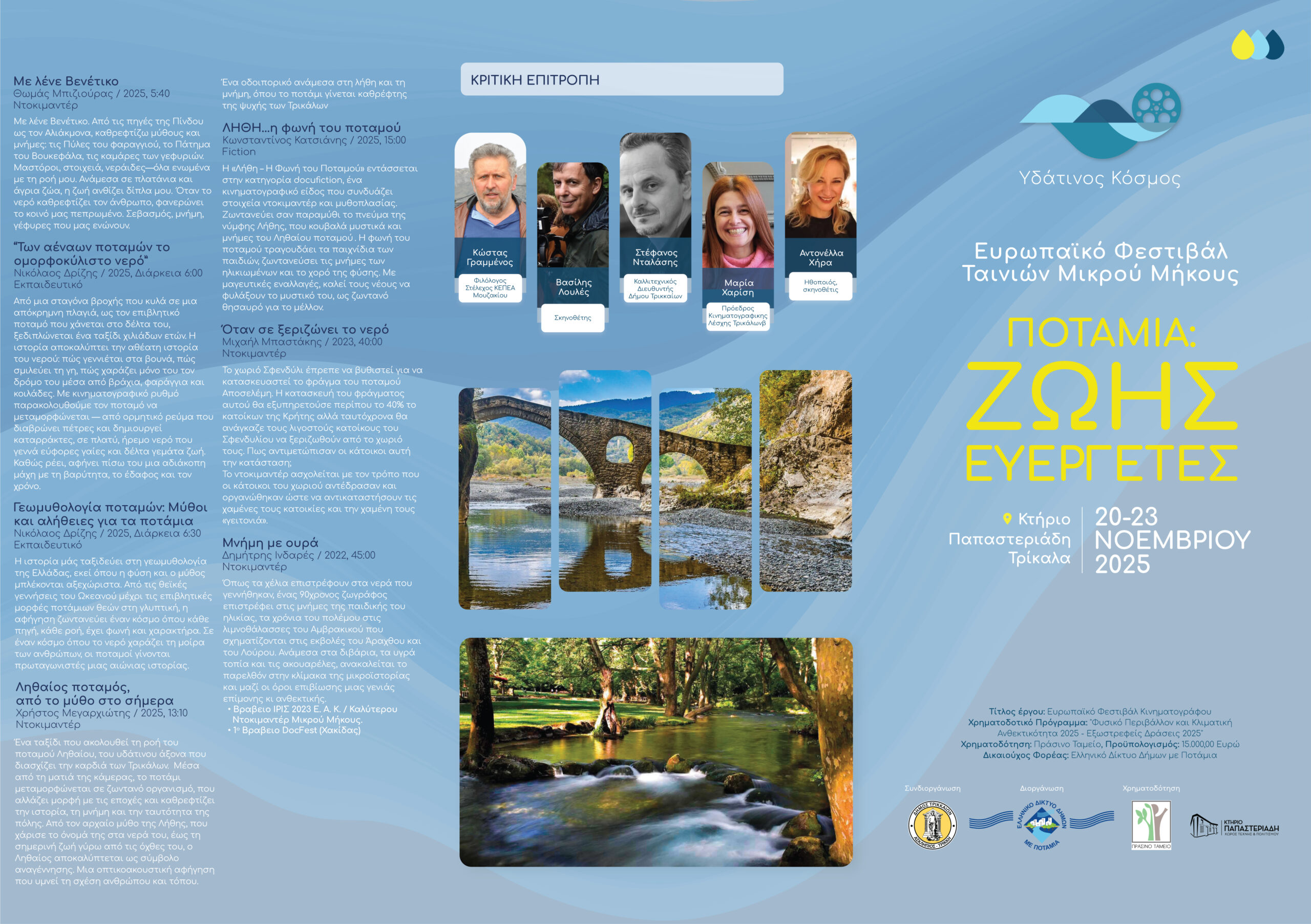 Το Ελληνικό Δίκτυο Δήμων με Ποτάμια, σε συνεργασία με τον Δήμο Τρικκαίων και χρηματοδότηση του Πράσινου Ταμείου, ανοίγει επίσημα στα Τρίκαλα από τις 20 έως τις 23 Νοεμβρίου 2025 τις πύλες του Ευρωπαϊκού Φεστιβάλ Ταινιών Μικρού Μήκους “Υδάτινος Κόσμος”.