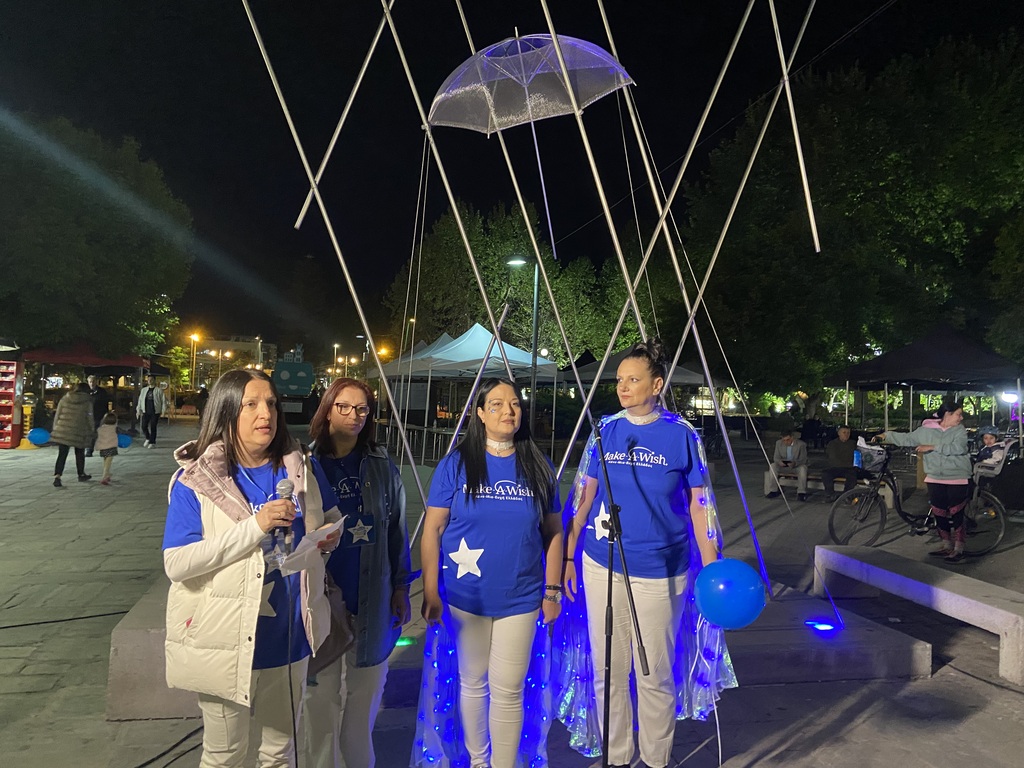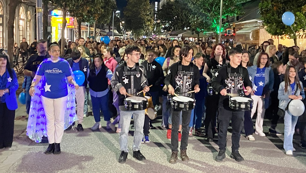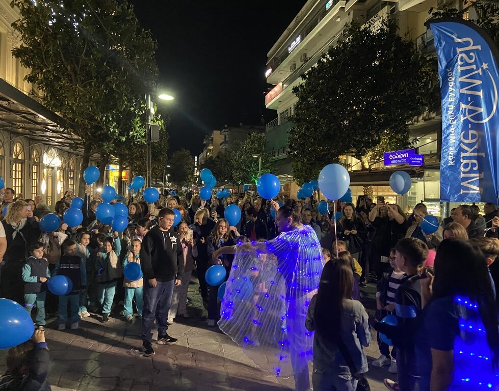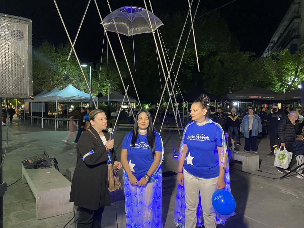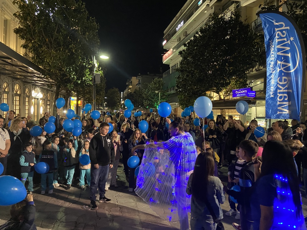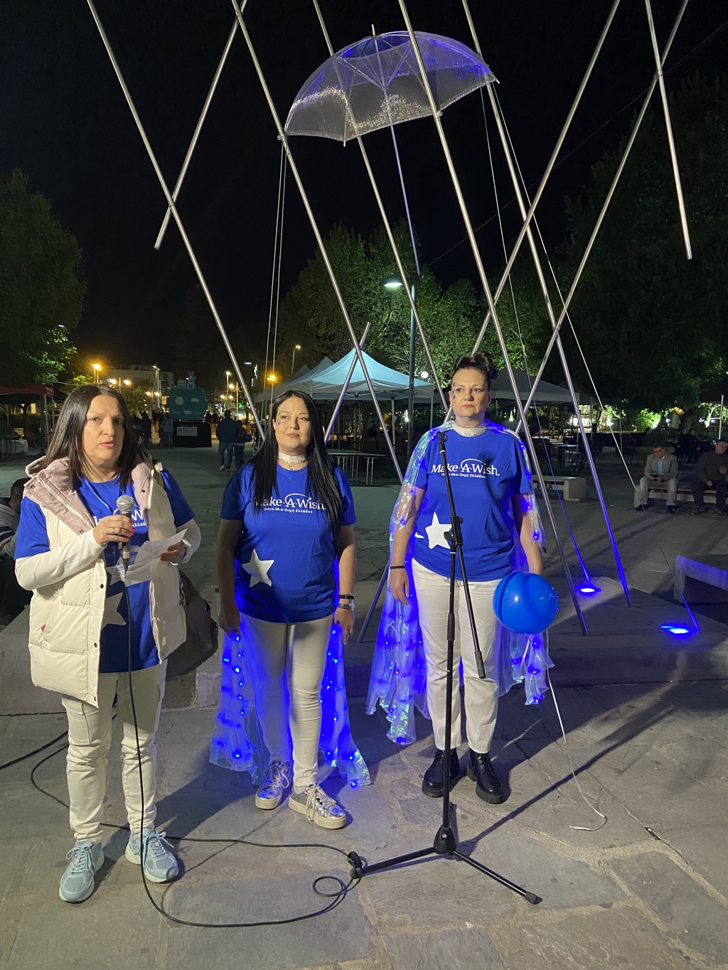 Στη συνέχεια πραγματοποιήθηκεπορεία με φωτισμένα φαναράκια στους κεντρικούς δρόμους της πόλης, με κατάληξη την Ομπρέλα Ζογγολόπουλου, λίγα μέτρα πιο μακριά από τη φωταγωγημένη με το μπλε χρώμα για την εκδήλωση, κεντρική πεζογέφυρα των Τρικάλων. Εκεί, μίλησαν παιδιά που ικανοποίησαν ευχές τους, συγκινώντας κάθε παριστάμενο/η. Στη συνέχεια, η υπεύθυνη δράσης του Make A Wish Ελλάδας για τα Τρίκαλα – μητέρα παιδιού ευχής κ. Μαρίνα Παλλαντζά, αναφέρθηκε στους σκοπούς της οργάνωσης και στο χαμόγελο που προσφέρει σε παιδιά. Ευχαρίστησε τον Δήμο Τρικκαίων για την ενεργή στήριξη και συνδιοργάνωση, ενώ αναφέρθηκε ευχαριστώντας και «τους Συλλόγους Γονέων και Κηδεμόνων σχολείων Πρωτοβάθμιας και Δευτεροβάθμιας Εκδήλωσης, που παρέστησαν στην εκδήλωση, στα ΚΔΑΠ ΑΓΙΑ ΑΝΝΑ και ΑΠΙΘΑΝΟΙ, στην ACT4V, στο Σώμα Ελληνικού Οδηγισμού, που συμμετείχαν στις δραστηριότητες, στη χορηγό εταιρεία ΒΙΟΣΑΛ, στις εμψυχώτριες Βίκυ Φαγκρίδα και Βάγια Γουλοπούλου, στο Βιβλιοπωλείο Παπαγιάννη, στον Φώτη Πάσσο για τις βιντεολήψεις, στον Ηλία Ζαχαράκη Foto Center για τις φωτογραφίες, στη Rock School of Music και τον Κώστα Μυλωνά, στη Χρύσα Παπαγεωργίου για το face painting, τις εκτυπώσεις αδελφών Μπέκου, την επιχείρηση «Σαν παραμύθι» – Χριστίνα Αλιπράντη».
