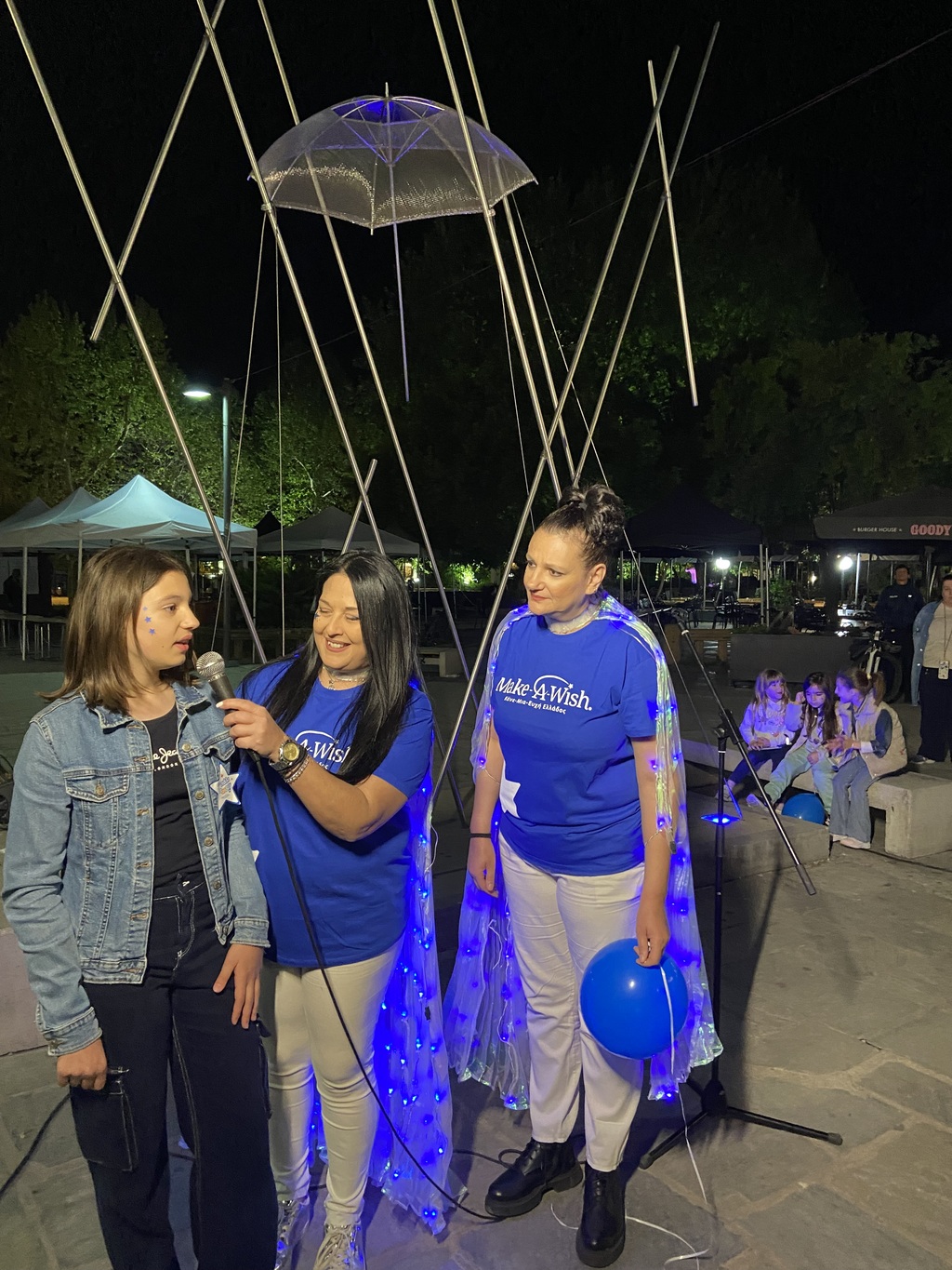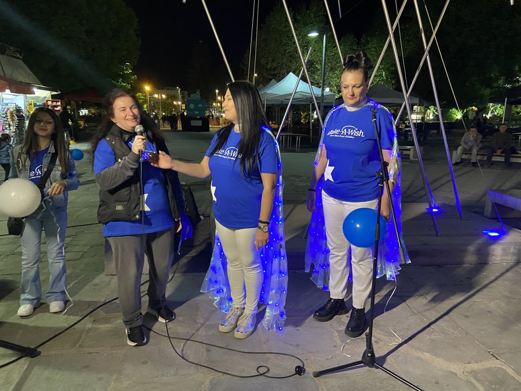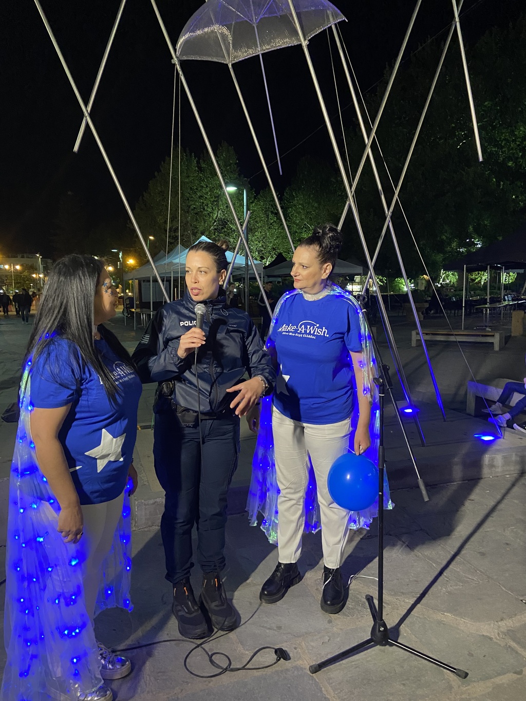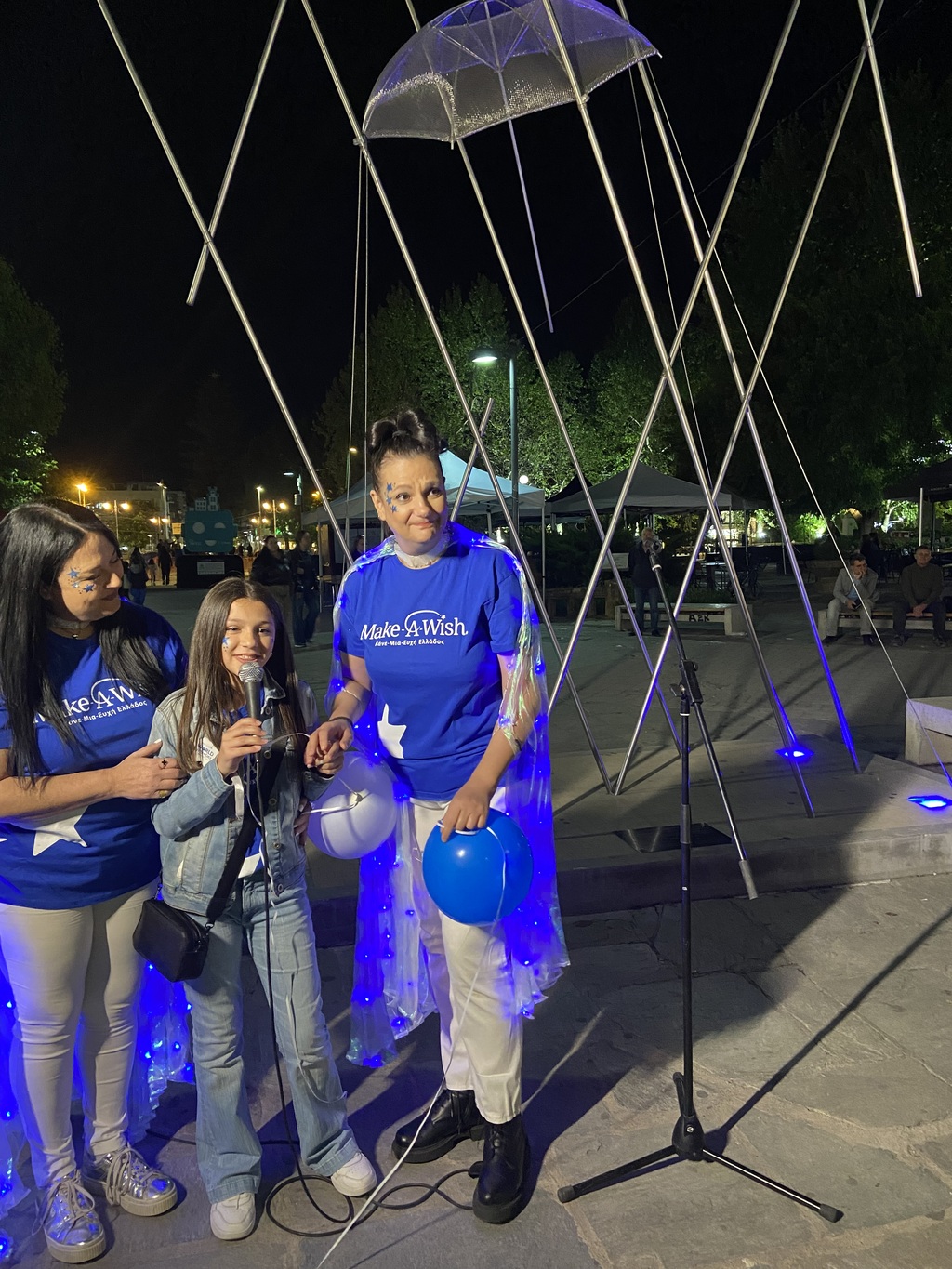 Στη συνέχεια πραγματοποιήθηκεπορεία με φωτισμένα φαναράκια στους κεντρικούς δρόμους της πόλης, με κατάληξη την Ομπρέλα Ζογγολόπουλου, λίγα μέτρα πιο μακριά από τη φωταγωγημένη με το μπλε χρώμα για την εκδήλωση, κεντρική πεζογέφυρα των Τρικάλων. Εκεί, μίλησαν παιδιά που ικανοποίησαν ευχές τους, συγκινώντας κάθε παριστάμενο/η. Στη συνέχεια, η υπεύθυνη δράσης του Make A Wish Ελλάδας για τα Τρίκαλα – μητέρα παιδιού ευχής κ. Μαρίνα Παλλαντζά, αναφέρθηκε στους σκοπούς της οργάνωσης και στο χαμόγελο που προσφέρει σε παιδιά. Ευχαρίστησε τον Δήμο Τρικκαίων για την ενεργή στήριξη και συνδιοργάνωση, ενώ αναφέρθηκε ευχαριστώντας και «τους Συλλόγους Γονέων και Κηδεμόνων σχολείων Πρωτοβάθμιας και Δευτεροβάθμιας Εκδήλωσης, που παρέστησαν στην εκδήλωση, στα ΚΔΑΠ ΑΓΙΑ ΑΝΝΑ και ΑΠΙΘΑΝΟΙ, στην ACT4V, στο Σώμα Ελληνικού Οδηγισμού, που συμμετείχαν στις δραστηριότητες, στη χορηγό εταιρεία ΒΙΟΣΑΛ, στις εμψυχώτριες Βίκυ Φαγκρίδα και Βάγια Γουλοπούλου, στο Βιβλιοπωλείο Παπαγιάννη, στον Φώτη Πάσσο για τις βιντεολήψεις, στον Ηλία Ζαχαράκη Foto Center για τις φωτογραφίες, στη Rock School of Music και τον Κώστα Μυλωνά, στη Χρύσα Παπαγεωργίου για το face painting, τις εκτυπώσεις αδελφών Μπέκου, την επιχείρηση «Σαν παραμύθι» – Χριστίνα Αλιπράντη».